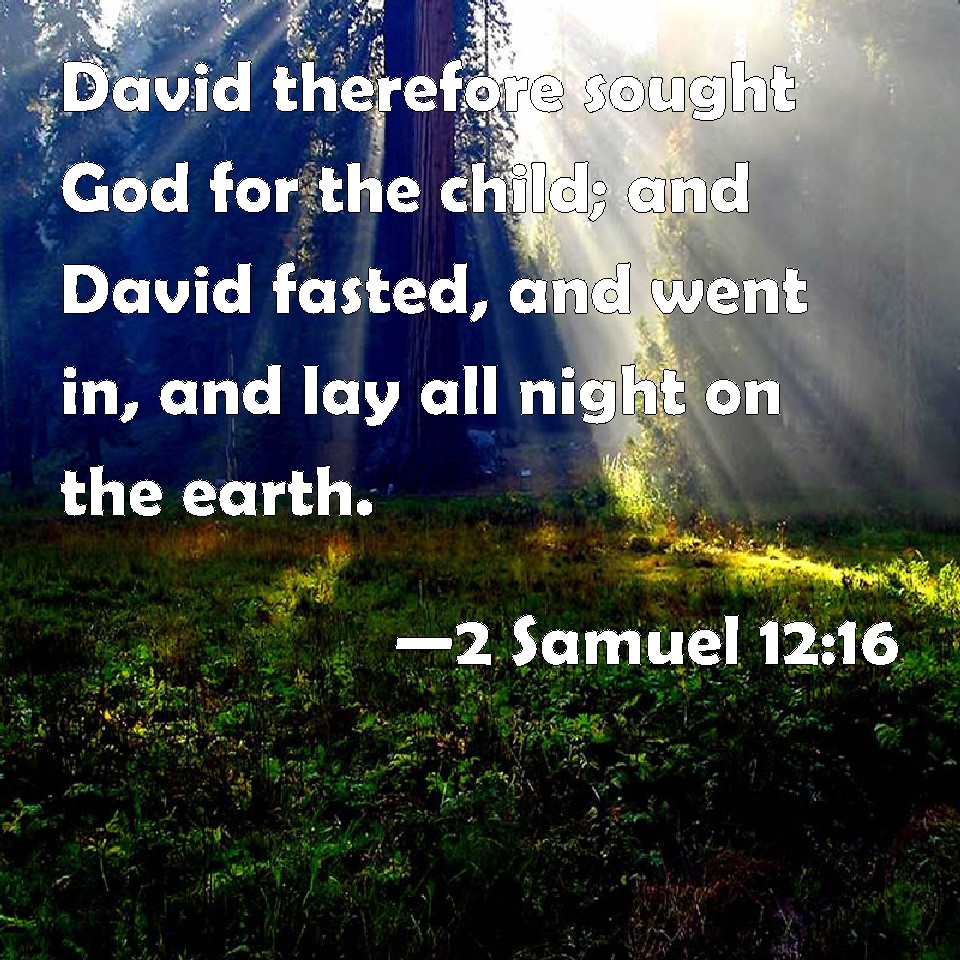 Choose a Background 2 Samuel 12:16 David therefore sought God for the child; and David fasted, and went in, and lay all night on the earth. KJV: David therefore besought God for the child; and David fasted, and went in, and lay all night upon the earth. DRB: And David besought the Lord for the child: and David kept a fast, and going in by himself lay upon the ground. DBT: And David besought God for the child; and David fasted, and went in, and lay all night on the earth. ERV: David therefore besought God for the child; and David fasted, and went in, and lay all night upon the earth. WBT: David therefore besought God for the child; and David fasted, and went in, and lay all night upon the earth. WEB: David therefore begged God for the child; and David fasted, and went in, and lay all night on the earth. YLT: and David seeketh God for the youth, and David keepeth a fast, and hath gone in and lodged, and lain on the earth.Links 2 Samuel 12:16 NIV • 2 Samuel 12:16 NLT • 2 Samuel 12:16 ESV • 2 Samuel 12:16 NASB • 2 Samuel 12:16 KJV • 2 Samuel 12:16 Interlinear • 2 Samuel 12:16 Commentaries • 2 Samuel 12:16 Parallel Texts • 2 Samuel 12:16 Bible Apps • 2 Samuel 12:16 Parallel • Bible Hub |