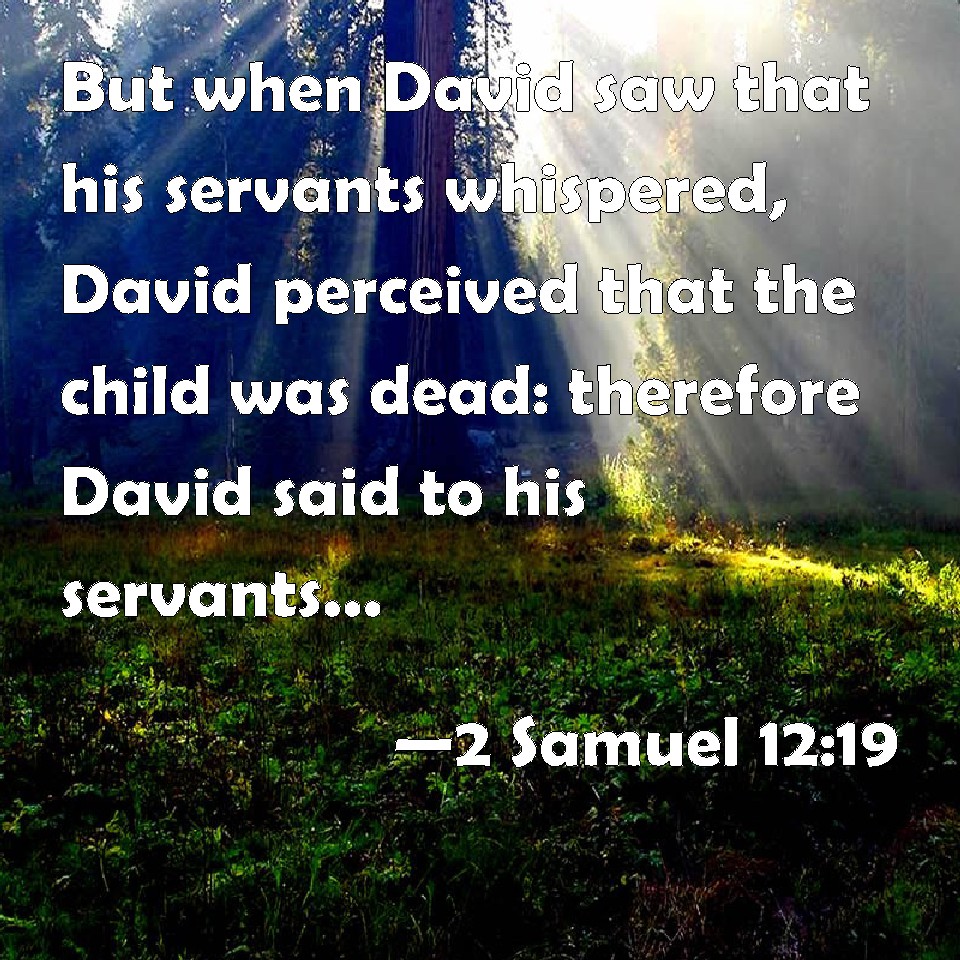 Choose a Background 2 Samuel 12:19 But when David saw that his servants whispered, David perceived that the child was dead: therefore David said to his servants, Is the child dead? And they said, He is dead. KJV: But when David saw that his servants whispered, David perceived that the child was dead: therefore David said unto his servants, Is the child dead? And they said, He is dead. DRB: But when David saw his servants whispering, he understood that the child was dead: and he said to his servants: Is the child dead? They answered him: He is dead. DBT: But David saw that his servants whispered, and David perceived that the child was dead; and David said to his servants, Is the child dead? And they said, He is dead. ERV: But when David saw that his servants whispered together, David perceived that the child was dead: and David said unto his servants, Is the child dead? And they said, He is dead. WBT: But when David saw that his servants whispered, David perceived that the child was dead: therefore David said to his servants, Is the child dead? And they said, He is dead. WEB: But when David saw that his servants were whispering together, David perceived that the child was dead; and David said to his servants, "Is the child dead?" They said, "He is dead." YLT: And David seeth that his servants are whispering, and David understandeth that the lad is dead, and David saith unto his servants, 'Is the lad dead?' and they say, 'Dead.'Links 2 Samuel 12:19 NIV • 2 Samuel 12:19 NLT • 2 Samuel 12:19 ESV • 2 Samuel 12:19 NASB • 2 Samuel 12:19 KJV • 2 Samuel 12:19 Interlinear • 2 Samuel 12:19 Commentaries • 2 Samuel 12:19 Parallel Texts • 2 Samuel 12:19 Bible Apps • 2 Samuel 12:19 Parallel • Bible Hub |