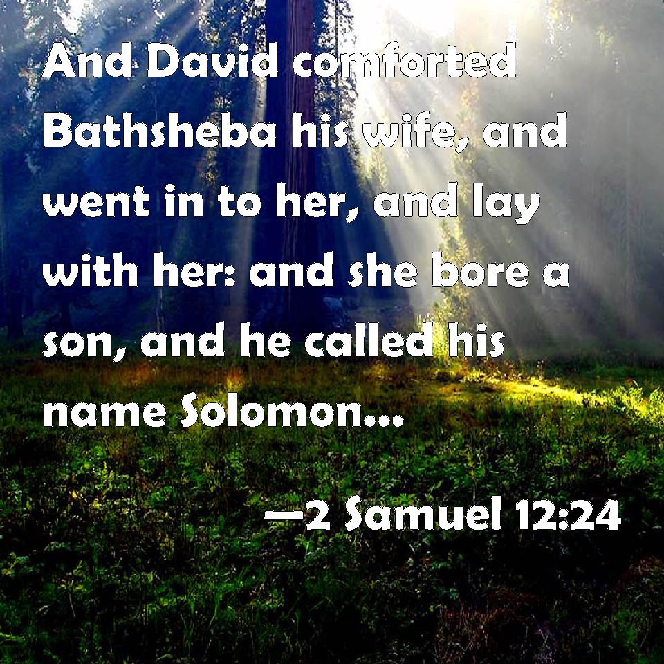 Choose a Background 2 Samuel 12:24 And David comforted Bathsheba his wife, and went in to her, and lay with her: and she bore a son, and he called his name Solomon: and the LORD loved him. KJV: And David comforted Bathsheba his wife, and went in unto her, and lay with her: and she bare a son, and he called his name Solomon: and the LORD loved him. DRB: And David comforted Bethsabee his wife, and went in unto her, and slept with her: and she bore a son, and he called his name Solomon, and the Lord loved him. DBT: And David comforted Bathsheba his wife, and went in to her and lay with her; and she bore a son, and he called his name Solomon; and Jehovah loved him. ERV: And David comforted Bath-sheba his wife, and went in unto her, and lay with her: and she bare a son, and he called his name Solomon. And the LORD loved him; WBT: And David comforted Bath-sheba his wife, and went in to her, and lay with her: and she bore a son, and he called his name Solomon: and the LORD loved him. WEB: David comforted Bathsheba his wife, and went in to her, and lay with her. She bore a son, and he called his name Solomon. Yahweh loved him; YLT: And David comforteth Bath-Sheba his wife, and goeth in unto her, and lieth with her, and she beareth a son, and he calleth his name Solomon; and Jehovah hath loved him,Links 2 Samuel 12:24 NIV • 2 Samuel 12:24 NLT • 2 Samuel 12:24 ESV • 2 Samuel 12:24 NASB • 2 Samuel 12:24 KJV • 2 Samuel 12:24 Interlinear • 2 Samuel 12:24 Commentaries • 2 Samuel 12:24 Parallel Texts • 2 Samuel 12:24 Bible Apps • 2 Samuel 12:24 Parallel • Bible Hub |
