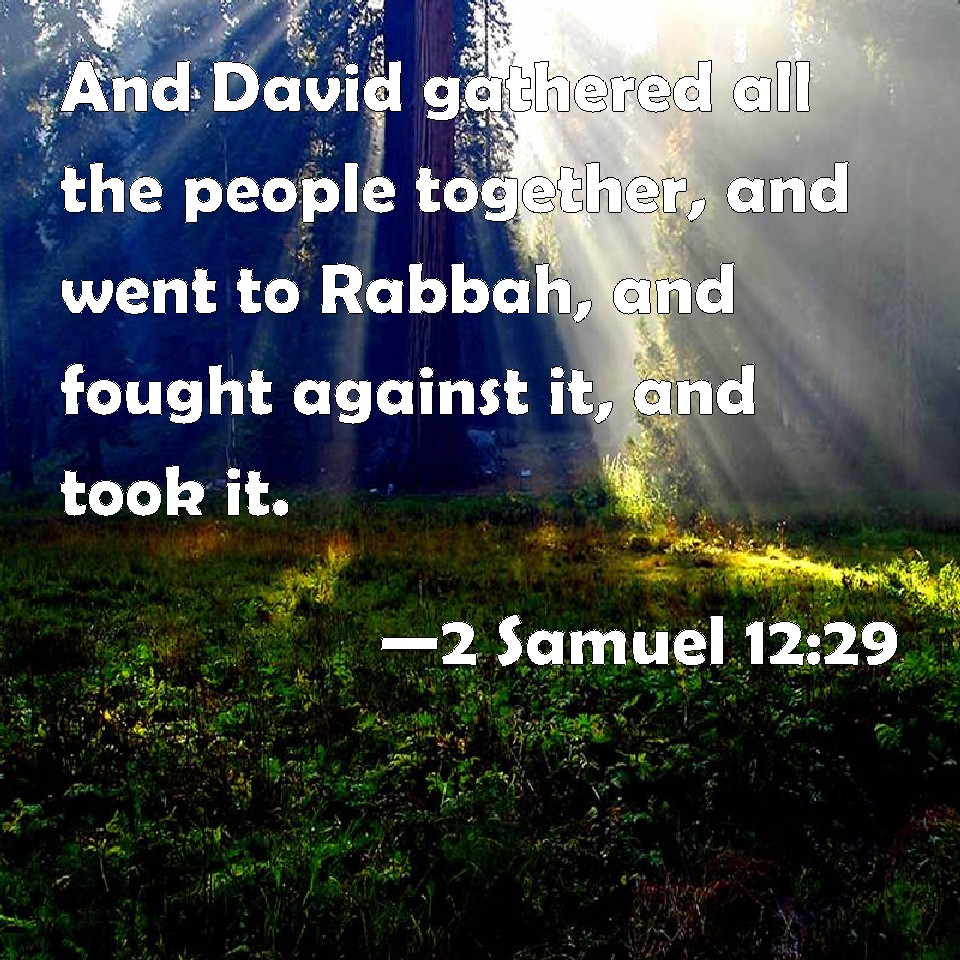 Choose a Background 2 Samuel 12:29 And David gathered all the people together, and went to Rabbah, and fought against it, and took it. KJV: And David gathered all the people together, and went to Rabbah, and fought against it, and took it. DRB: Then David gathered all the people together, and went out against Rabbath: and after fighting, he took it. DBT: And David gathered all the people, and went to Rabbah, and fought against it and took it. ERV: And David gathered all the people together, and went to Rabbah, and fought against it, and took it. WBT: And David collected all the people, and went to Rabbah, and fought against it, and took it. WEB: David gathered all the people together, and went to Rabbah, and fought against it, and took it. YLT: And David gathereth all the people, and goeth to Rabbah, and fighteth against it, and captureth it;Links 2 Samuel 12:29 NIV • 2 Samuel 12:29 NLT • 2 Samuel 12:29 ESV • 2 Samuel 12:29 NASB • 2 Samuel 12:29 KJV • 2 Samuel 12:29 Interlinear • 2 Samuel 12:29 Commentaries • 2 Samuel 12:29 Parallel Texts • 2 Samuel 12:29 Bible Apps • 2 Samuel 12:29 Parallel • Bible Hub |