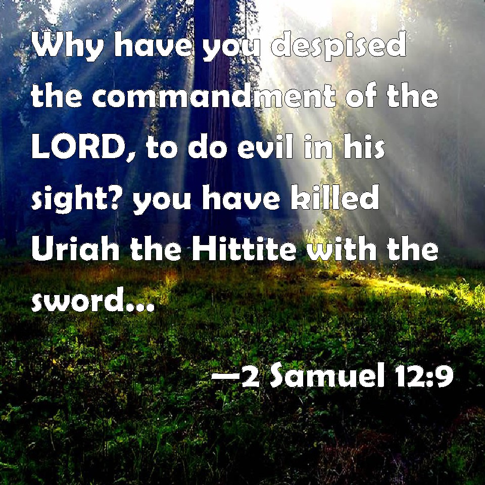 Choose a Background 2 Samuel 12:9 Why have you despised the commandment of the LORD, to do evil in his sight? you have killed Uriah the Hittite with the sword, and have taken his wife to be your wife, and have slain him with the sword of the children of Ammon. KJV: Wherefore hast thou despised the commandment of the LORD, to do evil in his sight? thou hast killed Uriah the Hittite with the sword, and hast taken his wife to be thy wife, and hast slain him with the sword of the children of Ammon. DRB: Why therefore hast thou despised the word of the Lord, to do evil in my sight? Thou hast killed Urias the Hethite with the sword, and hast taken his wife to be thy wife, and hast slain him with the sword of the children of Ammon. DBT: Wherefore hast thou despised the word of Jehovah to do evil in his sight? thou hast smitten Urijah the Hittite with the sword, and hast taken his wife to be thy wife, and hast slain him with the sword of the children of Ammon. ERV: Wherefore hast thou despised the word of the LORD, to do that which is evil in his sight? thou hast smitten Uriah the Hittite with the sword, and hast taken his wife to be thy wife, and hast slain him with the sword of the children of Ammon. WBT: Why hast thou despised the commandment of the LORD, to do evil in his sight? thou hast killed Uriah the Hittite with the sword, and hast taken his wife to be thy wife, and hast slain him with the sword of the children of Ammon. WEB: Why have you despised the word of Yahweh, to do that which is evil in his sight? You have struck Uriah the Hittite with the sword, and have taken his wife to be your wife, and have slain him with the sword of the children of Ammon. YLT: 'Wherefore hast thou despised the word of Jehovah, to do the evil thing in His eyes? Uriah the Hittite thou hast smitten by the sword, and his wife thou hast taken to thee for a wife, and him thou hast slain by the sword of the Bene-Ammon.Links 2 Samuel 12:9 NIV • 2 Samuel 12:9 NLT • 2 Samuel 12:9 ESV • 2 Samuel 12:9 NASB • 2 Samuel 12:9 KJV • 2 Samuel 12:9 Interlinear • 2 Samuel 12:9 Commentaries • 2 Samuel 12:9 Parallel Texts • 2 Samuel 12:9 Bible Apps • 2 Samuel 12:9 Parallel • Bible Hub |