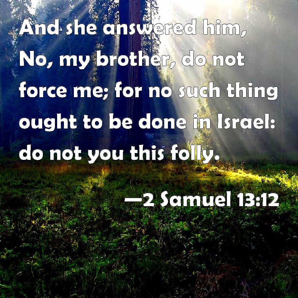 Choose a Background 2 Samuel 13:12 And she answered him, No, my brother, do not force me; for no such thing ought to be done in Israel: do not you this folly. KJV: And she answered him, Nay, my brother, do not force me; for no such thing ought to be done in Israel: do not thou this folly. DRB: She answered him: Do not so, my brother, do not force me: for no such thing must be done in Israel. Do not thou this folly. DBT: And she said to him, No, my brother, do not humble me; for no such thing is done in Israel: do not this infamy. ERV: And she answered him, Nay, my brother, do not force me; for no such thing ought to be done in Israel: do not thou this folly. WBT: And she answered him, Nay, my brother, do not force me; for no such thing ought to be done in Israel: do not thou this folly. WEB: She answered him, "No, my brother, do not force me! For no such thing ought to be done in Israel. Don't you do this folly. YLT: And she saith to him, 'Nay, my brother, do not humble me, for it is not done so in Israel; do not this folly.Links 2 Samuel 13:12 NIV • 2 Samuel 13:12 NLT • 2 Samuel 13:12 ESV • 2 Samuel 13:12 NASB • 2 Samuel 13:12 KJV • 2 Samuel 13:12 Interlinear • 2 Samuel 13:12 Commentaries • 2 Samuel 13:12 Parallel Texts • 2 Samuel 13:12 Bible Apps • 2 Samuel 13:12 Parallel • Bible Hub |