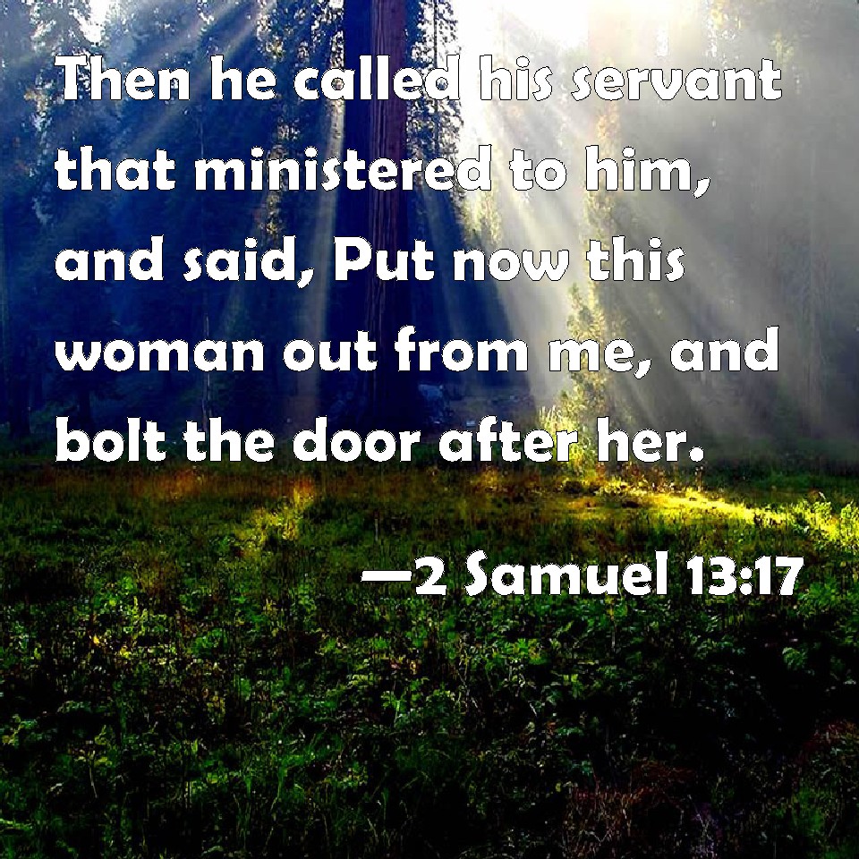 Choose a Background 2 Samuel 13:17 Then he called his servant that ministered to him, and said, Put now this woman out from me, and bolt the door after her. KJV: Then he called his servant that ministered unto him, and said, Put now this woman out from me, and bolt the door after her. DRB: But calling the servants that ministered to him, he said: Thrust this woman out from me: and shut the door after her. DBT: Then he called his young man that attended upon him, and said, Put now this woman out from me, and bolt the door after her. ERV: Then he called his servant that ministered unto him, and said, Put now this woman out from me, and bolt the door after her. WBT: Then he called his servant that ministered to him, and said, Put now this woman out from me, and bolt the door after her. WEB: Then he called his servant who ministered to him, and said, "Put now this woman out from me, and bolt the door after her." YLT: and calleth his young man, his servant, and saith, 'Send away, I pray thee, this one from me without, and bolt the door after her;'Links 2 Samuel 13:17 NIV • 2 Samuel 13:17 NLT • 2 Samuel 13:17 ESV • 2 Samuel 13:17 NASB • 2 Samuel 13:17 KJV • 2 Samuel 13:17 Interlinear • 2 Samuel 13:17 Commentaries • 2 Samuel 13:17 Parallel Texts • 2 Samuel 13:17 Bible Apps • 2 Samuel 13:17 Parallel • Bible Hub |
