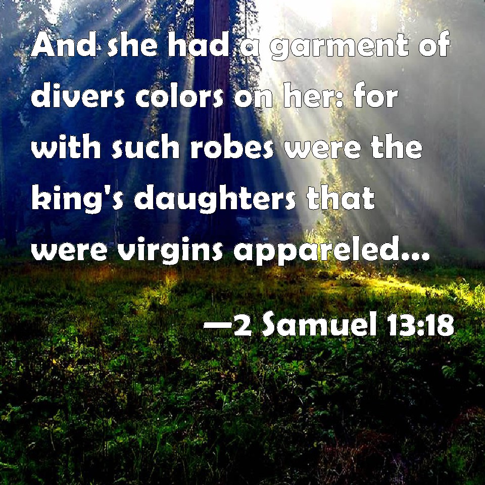 Choose a Background 2 Samuel 13:18 And she had a garment of divers colors on her: for with such robes were the king's daughters that were virgins appareled. Then his servant brought her out, and bolted the door after her. KJV: And she had a garment of divers colours upon her: for with such robes were the king's daughters that were virgins apparelled. Then his servant brought her out, and bolted the door after her. DRB: And she was clothed with along robe: for the king's daughters that were virgins, used such kind of garments. Then his servant thrust her out: and shut the door after her. DBT: Now she had a vest of many colours upon her; for so were the king's daughters that were virgins apparelled. And his attendant brought her out, and bolted the door after her. ERV: And she had a garment of divers colours upon her: for with such robes were the king's daughters that were virgins apparelled. Then his servant brought her out, and bolted the door after her. WBT: And she had a garment of divers colors upon her: for with such robes were the king's daughters that were virgins appareled. Then his servant brought her out, and bolted the door after her. WEB: She had a garment of various colors on her; for with such robes were the king's daughters who were virgins dressed. Then his servant brought her out, and bolted the door after her. YLT: — and upon her is a long coat, for such upper robes do daughters of the king who are virgins put on, — and his servant taketh her out without, and hath bolted the door after her.Links 2 Samuel 13:18 NIV • 2 Samuel 13:18 NLT • 2 Samuel 13:18 ESV • 2 Samuel 13:18 NASB • 2 Samuel 13:18 KJV • 2 Samuel 13:18 Interlinear • 2 Samuel 13:18 Commentaries • 2 Samuel 13:18 Parallel Texts • 2 Samuel 13:18 Bible Apps • 2 Samuel 13:18 Parallel • Bible Hub |