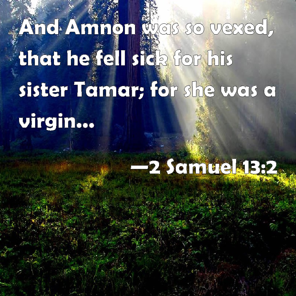 Amnon was so troubled that he fell sick because of his sister Tamar; for she was a virgin; and it seemed hard to Amnon to do anything to her.