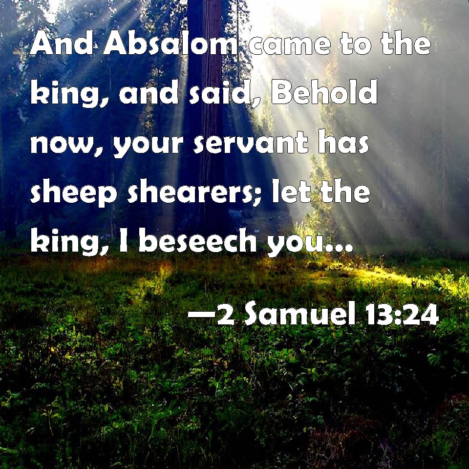 Choose a Background 2 Samuel 13:24 And Absalom came to the king, and said, Behold now, your servant has sheep shearers; let the king, I beseech you, and his servants go with your servant. KJV: And Absalom came to the king, and said, Behold now, thy servant hath sheepshearers; let the king, I beseech thee, and his servants go with thy servant. DRB: And he came to the king, and said to him: Behold thy servant's sheep are shorn. Let the king, I pray, with his servants come to his servant. DBT: And Absalom came to the king, and said, Behold, now, thy servant has sheepshearers; let the king, I pray thee, and his servants go with thy servant. ERV: And Absalom came to the king, and said, Behold now, thy servant hath sheepshearers; let the king, I pray thee, and his servants go with thy servant. WBT: And Absalom came to the king, and said, Behold now, thy servant hath sheep-shearers; let the king, I beseech thee, and his servants go with thy servant. WEB: Absalom came to the king, and said, "See now, your servant has sheepshearers. Please let the king and his servants go with your servant." YLT: And Absalom cometh unto the king, and saith, 'Lo, I pray thee, thy servant hath shearers, let the king go, I pray thee, and his servants, with thy servant.'Links 2 Samuel 13:24 NIV • 2 Samuel 13:24 NLT • 2 Samuel 13:24 ESV • 2 Samuel 13:24 NASB • 2 Samuel 13:24 KJV • 2 Samuel 13:24 Interlinear • 2 Samuel 13:24 Commentaries • 2 Samuel 13:24 Parallel Texts • 2 Samuel 13:24 Bible Apps • 2 Samuel 13:24 Parallel • Bible Hub |