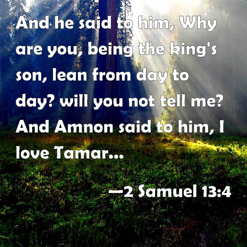Choose a Background 2 Samuel 13:4 And he said to him, Why are you, being the king's son, lean from day to day? will you not tell me? And Amnon said to him, I love Tamar, my brother Absalom's sister. KJV: And he said unto him, Why art thou, being the king's son, lean from day to day? wilt thou not tell me? And Amnon said unto him, I love Tamar, my brother Absalom's sister. DRB: And he said to him: Why dost thou grow so lean from day to day, O son of the king? why dost thou not tell me the reason of it? And Amnon said to him: I am in love with Thamar the sister of my brother Absalom. DBT: And he said to him, Why dost thou, the king's son, get thinner from morning to morning? Wilt thou not tell me? And Amnon said to him, I love Tamar, my brother Absalom's sister. ERV: And he said unto him, Why, O son of the king, art thou thus lean from day to day? wilt thou not tell me? And Amnon said unto him, I love Tamar, my brother Absalom's sister. WBT: And he said to him, Why art thou, being the king's son, pining from day to day? wilt thou not tell me? And Amnon said to him, I love Tamar, my brother Absalom's sister. WEB: He said to him, "Why, son of the king, are you so sad from day to day? Won't you tell me?" Amnon said to him, "I love Tamar, my brother Absalom's sister." YLT: and saith to him, 'Wherefore art thou thus lean, O king's son, morning by morning? dost thou not declare to me?' And Amnon saith to him, 'Tamar — sister of Absalom my brother — I am loving.'Links 2 Samuel 13:4 NIV • 2 Samuel 13:4 NLT • 2 Samuel 13:4 ESV • 2 Samuel 13:4 NASB • 2 Samuel 13:4 KJV • 2 Samuel 13:4 Interlinear • 2 Samuel 13:4 Commentaries • 2 Samuel 13:4 Parallel Texts • 2 Samuel 13:4 Bible Apps • 2 Samuel 13:4 Parallel • Bible Hub |