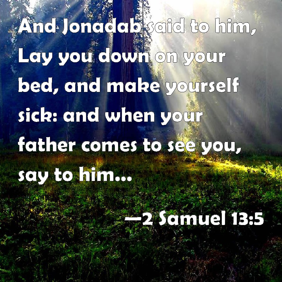 Choose a Background 2 Samuel 13:5 And Jonadab said to him, Lay you down on your bed, and make yourself sick: and when your father comes to see you, say to him, I pray you, let my sister Tamar come, and give me meat, and dress the meat in my sight, that I may see it, and eat it at her hand. KJV: And Jonadab said unto him, Lay thee down on thy bed, and make thyself sick: and when thy father cometh to see thee, say unto him, I pray thee, let my sister Tamar come, and give me meat, and dress the meat in my sight, that I may see it, and eat it at her hand. DRB: And Jonadab said to him: Lie down upon thy bed, and feign thyself sick: and when thy father shall come to visit thee, say to him: Let my sister Thamar, I pray thee, come to me, to give me to eat, and to make me a mess, that I may eat it at her hand. DBT: And Jonadab said to him, Lay thee down on thy bed and feign thyself sick; and when thy father comes to see thee, say to him, I pray thee, let my sister Tamar come, and give me food, and dress the food in my sight, that I may see it, and eat it from her hand. ERV: And Jonadab said unto him, Lay thee down on thy bed, and feign thyself sick: and when thy father cometh to see thee, say unto him, Let my sister Tamar come, I pray thee, and give me bread to eat, and dress the food in my sight, that I may see it, and eat it at her hand. WBT: And Jonadab said to him, Lay thee down on thy bed, and make thyself sick: and when thy father cometh to see thee, say to him, I pray thee, let my sister Tamar come, and give me food, and dress the food in my sight, that I may see it, and eat it at her hand. WEB: Jonadab said to him, "Lay down on your bed, and pretend to be sick. When your father comes to see you, tell him, 'Please let my sister Tamar come and give me bread to eat, and dress the food in my sight, that I may see it, and eat it from her hand.'" YLT: And Jonadab saith to him, 'Lie down on thy couch, and feign thyself sick, and thy father hath come in to see thee, and thou hast said unto him, 'Let, I pray thee, Tamar my sister come in and give me bread to eat; and she hath made the food before mine eyes so that I see it, and have eaten from her hand.'Links 2 Samuel 13:5 NIV • 2 Samuel 13:5 NLT • 2 Samuel 13:5 ESV • 2 Samuel 13:5 NASB • 2 Samuel 13:5 KJV • 2 Samuel 13:5 Interlinear • 2 Samuel 13:5 Commentaries • 2 Samuel 13:5 Parallel Texts • 2 Samuel 13:5 Bible Apps • 2 Samuel 13:5 Parallel • Bible Hub |