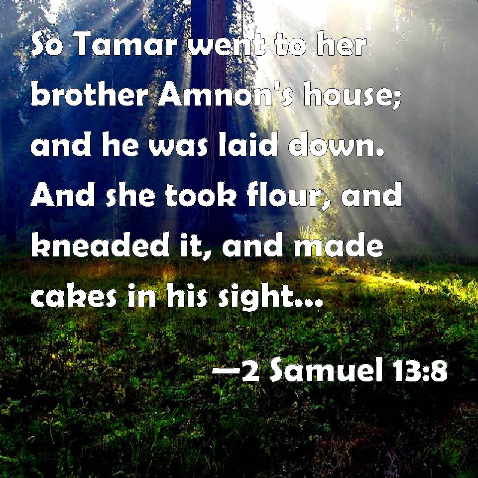 Choose a Background 2 Samuel 13:8 So Tamar went to her brother Amnon's house; and he was laid down. And she took flour, and kneaded it, and made cakes in his sight, and did bake the cakes. KJV: So Tamar went to her brother Amnon's house; and he was laid down. And she took flour, and kneaded it, and made cakes in his sight, and did bake the cakes. DRB: And Thamar came to the house of Amnon her brother: but he was laid down: and she took meal and tempered it: and dissolving it in his sight she made little messes. DBT: And Tamar went to her brother Amnon's house; and he had lain down. And she took flour and kneaded it, and made cakes in his sight, and baked the cakes. ERV: So Tamar went to her brother Amnon's house; and he was laid down. And she took dough, and kneaded it, and made cakes in his sight, and did bake the cakes. WBT: So Tamar went to her brother Amnon's house; and he was laid down. And she took flour, and kneaded it, and made cakes in his sight, and baked the cakes. WEB: So Tamar went to her brother Amnon's house; and he was laid down. She took dough, and kneaded it, and made cakes in his sight, and baked the cakes. YLT: And Tamar goeth to the house of Amnon her brother, and he is lying down, and she taketh the dough, and kneadeth, and maketh cakes before his eyes, and cooketh the cakes,Links 2 Samuel 13:8 NIV • 2 Samuel 13:8 NLT • 2 Samuel 13:8 ESV • 2 Samuel 13:8 NASB • 2 Samuel 13:8 KJV • 2 Samuel 13:8 Interlinear • 2 Samuel 13:8 Commentaries • 2 Samuel 13:8 Parallel Texts • 2 Samuel 13:8 Bible Apps • 2 Samuel 13:8 Parallel • Bible Hub |