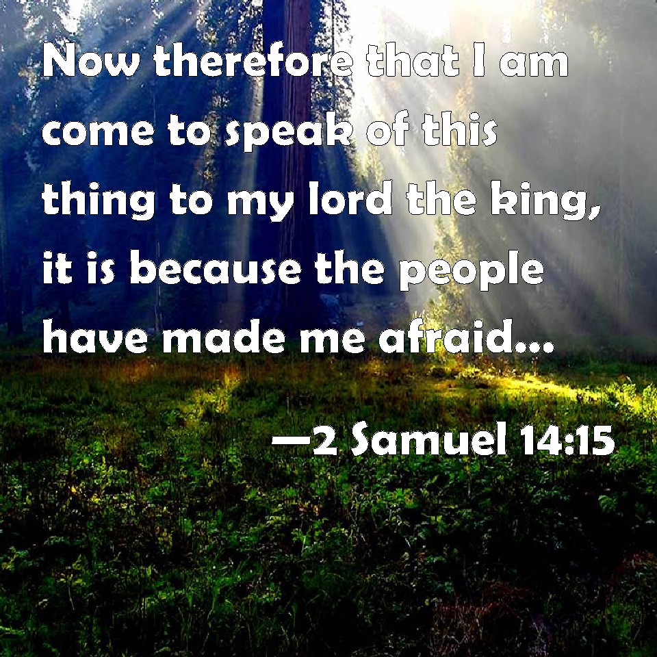 Choose a Background 2 Samuel 14:15 Now therefore that I am come to speak of this thing to my lord the king, it is because the people have made me afraid: and your handmaid said, I will now speak to the king; it may be that the king will perform the request of his handmaid. KJV: Now therefore that I am come to speak of this thing unto my lord the king, it is because the people have made me afraid: and thy handmaid said, I will now speak unto the king; it may be that the king will perform the request of his handmaid. DRB: Now therefore I am come, to speak this word to my lord the king before the people. And thy handmaid said: I will speak to the king, it maybe the king will perform the request of his handmaid. DBT: And now that I am come to speak of this thing to my lord the king, it is because the people have made me afraid; and thy bondmaid said, I will now speak to the king; perhaps the king will perform the request of his handmaid. ERV: Now therefore seeing that I am come to speak this word unto my lord the king, it is because the people have made me afraid: and thy handmaid said, I will now speak unto the king; it may be that the king will perform the request of his servant. WBT: Now therefore that I have come to speak of this thing to my lord the king, it is because the people have made me afraid: and thy handmaid said, I will now speak to the king; it may be that the king will perform the request of his handmaid. WEB: Now therefore seeing that I have come to speak this word to my lord the king, it is because the people have made me afraid: and your handmaid said, 'I will now speak to the king; it may be that the king will perform the request of his servant.' YLT: And now that I have come to speak unto the king my lord this word, it is because the people made me afraid, and thy maid-servant saith, Let me speak, I pray thee, unto the king; it may be the king doth do the word of his handmaid,Links 2 Samuel 14:15 NIV • 2 Samuel 14:15 NLT • 2 Samuel 14:15 ESV • 2 Samuel 14:15 NASB • 2 Samuel 14:15 KJV • 2 Samuel 14:15 Interlinear • 2 Samuel 14:15 Commentaries • 2 Samuel 14:15 Parallel Texts • 2 Samuel 14:15 Bible Apps • 2 Samuel 14:15 Parallel • Bible Hub |