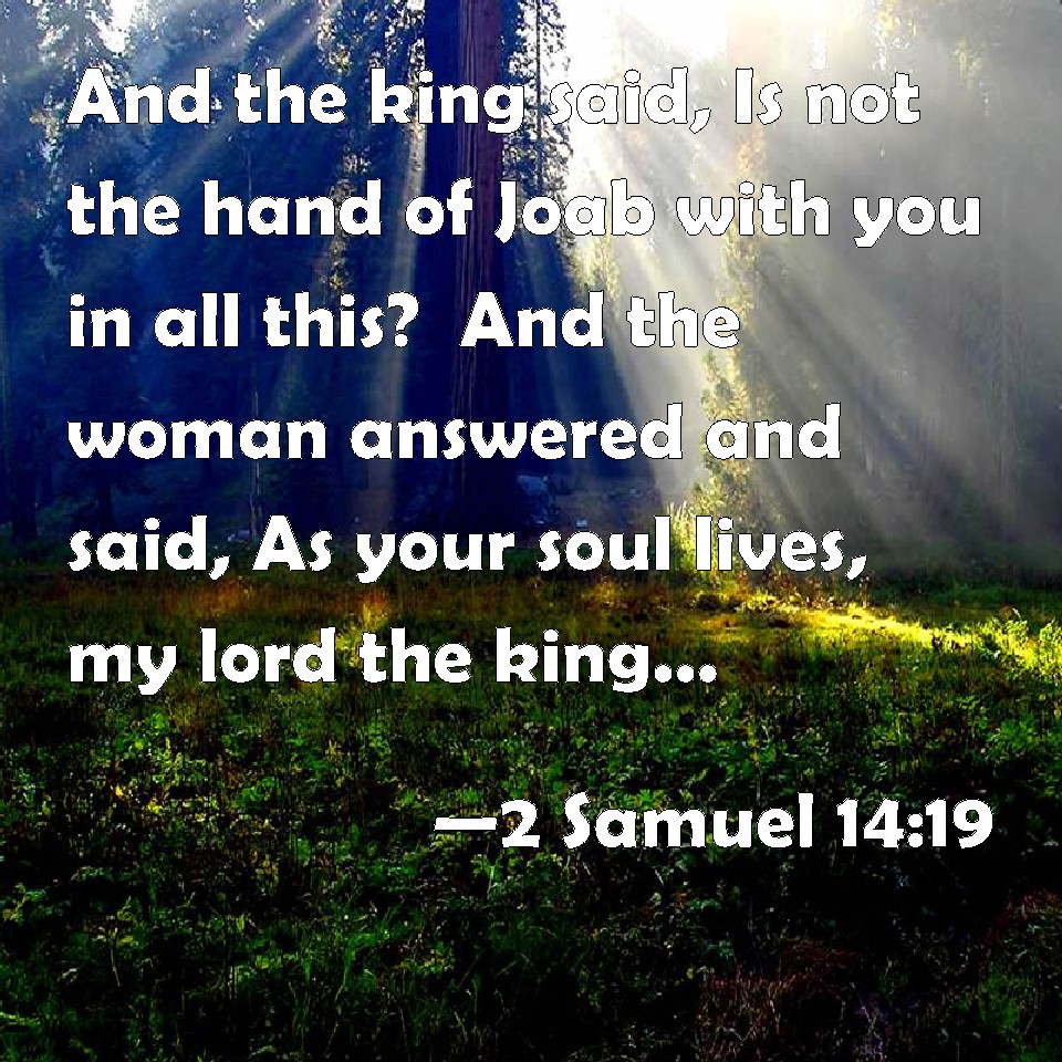 Choose a Background 2 Samuel 14:19 And the king said, Is not the hand of Joab with you in all this? And the woman answered and said, As your soul lives, my lord the king, none can turn to the right hand or to the left from ought that my lord the king has spoken: for your servant Joab, he bade me, and he put all these words in the mouth of your handmaid: KJV: And the king said, Is not the hand of Joab with thee in all this? And the woman answered and said, As thy soul liveth, my lord the king, none can turn to the right hand or to the left from ought that my lord the king hath spoken: for thy servant Joab, he bade me, and he put all these words in the mouth of thine handmaid: DRB: And the king said: Is not the hand of Joab with thee in all this? The woman answered, and said: By the health of thy soul, my lord, O king, it is neither on the left hand, nor on the right, in all these things which my lord the king hath spoken: for thy servant Joab, he commanded me, and he put all these words into the mouth of thy handmaid. DBT: And the king said, Is the hand of Joab with thee in all this? And the woman answered and said, As thy soul liveth, my lord, O king, there is no turning to the right hand or to the left from aught that my lord the king has spoken; for thy servant Joab, he bade me, and he put all these words into the mouth of thy bondmaid: ERV: And the king said, Is the hand of Joab with thee in all this? And the woman answered and said, As thy soul liveth, my lord the king, none can turn to the right hand or to the left from aught that my lord the king hath spoken: for thy servant Joab, he bade me, and he put all these words in the mouth of thine handmaid; WBT: And the king said, Is not the hand of Joab with thee in all this? And the woman answered and said, As thy soul liveth, my lord the king, none can turn to the right hand or to the left from aught that my lord the king hath spoken: for thy servant Joab, he bade me, and he put all these words in the mouth of thy handmaid: WEB: The king said, "Is the hand of Joab with you in all this?" The woman answered, "As your soul lives, my lord the king, no one can turn to the right hand or to the left from anything that my lord the king has spoken; for your servant Joab, he urged me, and he put all these words in the mouth of your handmaid; YLT: And the king saith, 'Is the hand of Joab with thee in all this?' And the woman answereth and saith, 'Thy soul liveth, my lord, O king, none doth turn to the right or to the left from all that my lord the king hath spoken; for thy servant Joab he commanded me, and he put in the mouth of thy maid-servant all these words;Links 2 Samuel 14:19 NIV • 2 Samuel 14:19 NLT • 2 Samuel 14:19 ESV • 2 Samuel 14:19 NASB • 2 Samuel 14:19 KJV • 2 Samuel 14:19 Interlinear • 2 Samuel 14:19 Commentaries • 2 Samuel 14:19 Parallel Texts • 2 Samuel 14:19 Bible Apps • 2 Samuel 14:19 Parallel • Bible Hub |