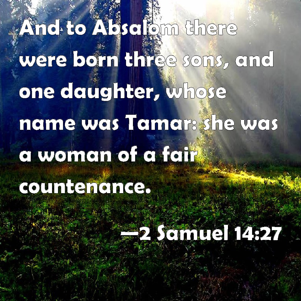 Choose a Background 2 Samuel 14:27 And to Absalom there were born three sons, and one daughter, whose name was Tamar: she was a woman of a fair countenance. KJV: And unto Absalom there were born three sons, and one daughter, whose name was Tamar: she was a woman of a fair countenance. DRB: And there were born to Absalom three sons: and one daughter, whose, name was Thamar, and she was very beautiful. DBT: And to Absalom there were born three sons, and one daughter, whose name was Tamar: she was a woman of a beautiful countenance. ERV: And unto Absalom there were born three sons, and one daughter, whose name was Tamar: she was a woman of a fair countenance. WBT: And to Absalom there were born three sons, and one daughter, whose name was Tamar: she was a woman of a fair countenance. WEB: To Absalom there were born three sons, and one daughter, whose name was Tamar: she was a woman of a beautiful face. YLT: And there are born to Absalom three sons, and one daughter, and her name is Tamar; she was a woman of a fair appearance.Links 2 Samuel 14:27 NIV • 2 Samuel 14:27 NLT • 2 Samuel 14:27 ESV • 2 Samuel 14:27 NASB • 2 Samuel 14:27 KJV • 2 Samuel 14:27 Interlinear • 2 Samuel 14:27 Commentaries • 2 Samuel 14:27 Parallel Texts • 2 Samuel 14:27 Bible Apps • 2 Samuel 14:27 Parallel • Bible Hub |