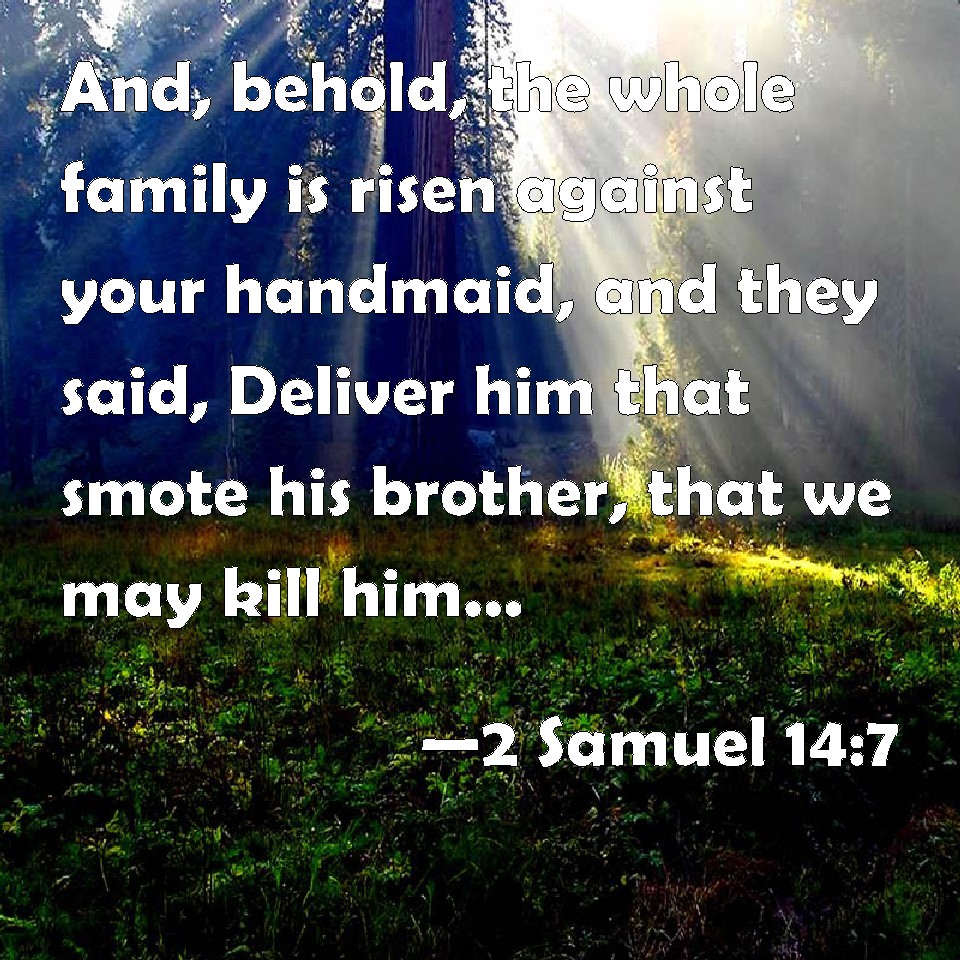 2 Samuel 14:7 And, behold, the whole family is risen against your handmaid, and they said, Deliver him that smote his brother, that we may kill him, for the life of his brother whom he slew; and we will destroy the heir also: and so they shall quench my coal which is left, and shall not leave to my husband neither name nor remainder on the earth.
