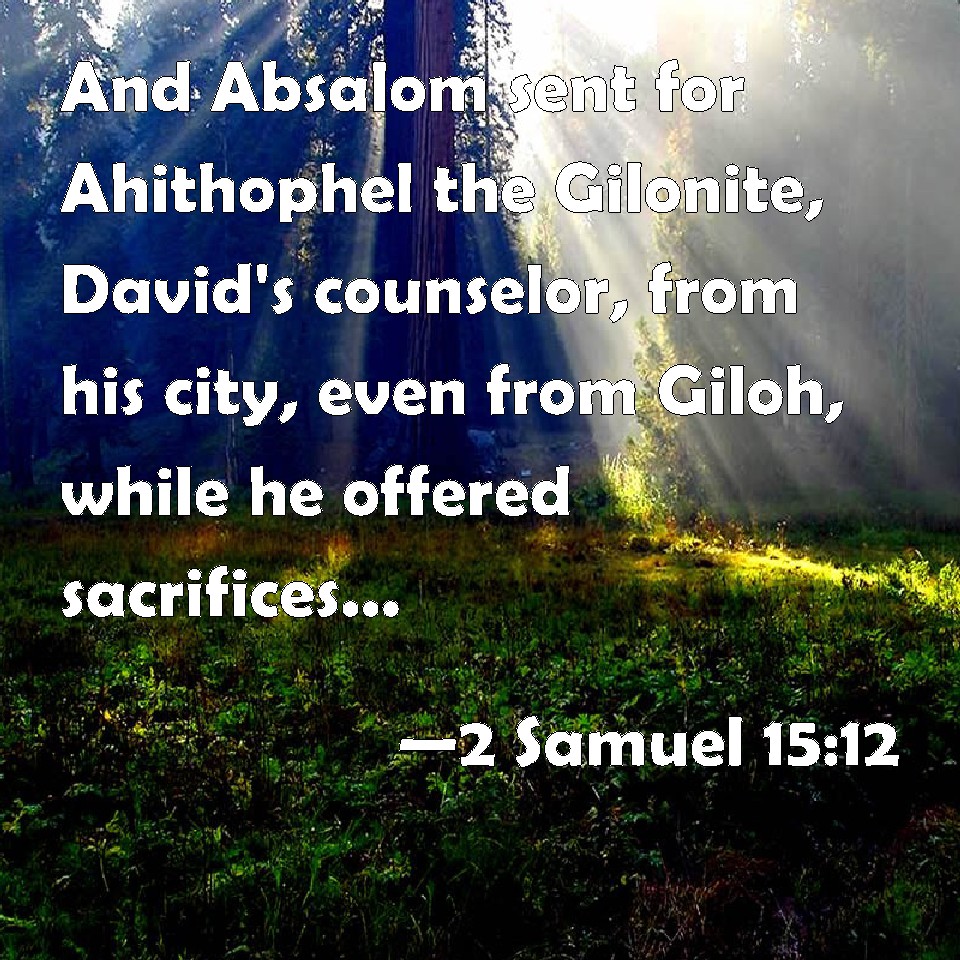 Choose a Background 2 Samuel 15:12 And Absalom sent for Ahithophel the Gilonite, David's counselor, from his city, even from Giloh, while he offered sacrifices. And the conspiracy was strong; for the people increased continually with Absalom. KJV: And Absalom sent for Ahithophel the Gilonite, David's counseller, from his city, even from Giloh, while he offered sacrifices. And the conspiracy was strong; for the people increased continually with Absalom. DRB: Absalom also sent for Achitophel the Gilonite, David's counsellor, from his city Gilo. And while he was offering sacrifices, there was a strong conspiracy, and the people running together increased with Absalom. DBT: And Absalom sent for Ahithophel the Gilonite, David's counsellor, from his city, from Giloh, while he offered the sacrifices. And the conspiracy gathered strength; and the people increased continually with Absalom. ERV: And Absalom sent for Ahithophel the Gilonite, David's counsellor, from his city, even from Giloh, while he offered the sacrifices. And the conspiracy was strong; for the people increased continually with Absalom. WBT: And Absalom sent for Ahithophel the Gilonite, David's counselor, from his city, even from Giloh, while he offered sacrifices. And the conspiracy was strong; for the people increased continually with Absalom. WEB: Absalom sent for Ahithophel the Gilonite, David's counselor, from his city, even from Giloh, while he was offering the sacrifices. The conspiracy was strong; for the people increased continually with Absalom. YLT: and Absalom sendeth Ahithophel the Gilonite, a counsellor of David, out of his city, out of Gilo, in his sacrificing sacrifices; and the conspiracy is strong, and the people are going and increasing with Absalom.Links 2 Samuel 15:12 NIV • 2 Samuel 15:12 NLT • 2 Samuel 15:12 ESV • 2 Samuel 15:12 NASB • 2 Samuel 15:12 KJV • 2 Samuel 15:12 Interlinear • 2 Samuel 15:12 Commentaries • 2 Samuel 15:12 Parallel Texts • 2 Samuel 15:12 Bible Apps • 2 Samuel 15:12 Parallel • Bible Hub |