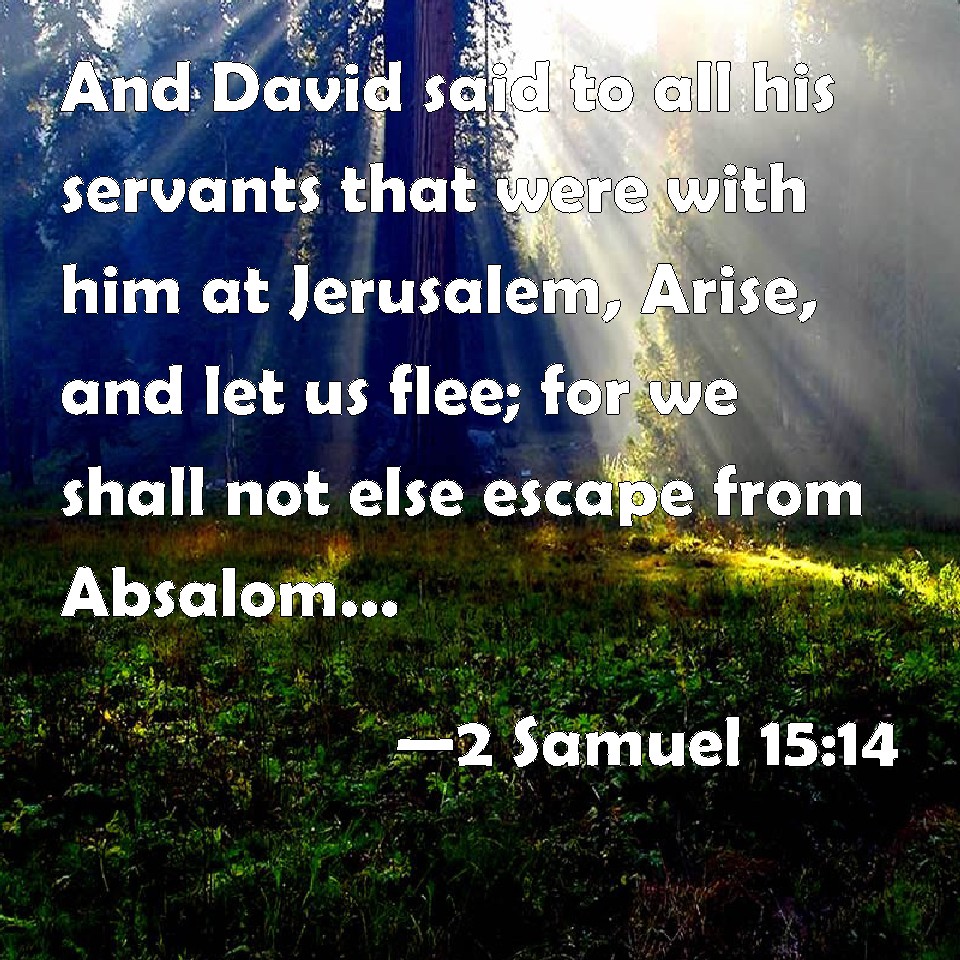 Choose a Background 2 Samuel 15:14 And David said to all his servants that were with him at Jerusalem, Arise, and let us flee; for we shall not else escape from Absalom: make speed to depart, lest he overtake us suddenly, and bring evil on us, and smite the city with the edge of the sword. KJV: And David said unto all his servants that were with him at Jerusalem, Arise, and let us flee; for we shall not else escape from Absalom: make speed to depart, lest he overtake us suddenly, and bring evil upon us, and smite the city with the edge of the sword. DRB: And David said to his servants, that were with him in Jerusalem: Arise and let us flee: for we shall not escape else from the face of Absalom: make haste to go out, lest he come and overtake us, and bring ruin upon us, and smite the city with the edge of the sword. DBT: And David said to all his servants that were with him at Jerusalem, Rise up and let us flee; for we shall not else escape from Absalom. Be quick to depart, lest he overtake us quickly, and bring evil upon us, and smite the city with the edge of the sword. ERV: And David said unto all his servants that were with him at Jerusalem, Arise, and let us flee; for else none of us shall escape from Absalom: make speed to depart, lest he overtake us quickly, and bring down evil upon us, and smite the city with the edge of the sword. WBT: And David said to all his servants that were with him at Jerusalem, Arise, and let us flee; for we shall not else escape from Absalom: make speed to depart, lest he should overtake us suddenly, and bring evil upon us, and smite the city with the edge of the sword. WEB: David said to all his servants who were with him at Jerusalem, "Arise, and let us flee; for else none of us shall escape from Absalom. Make speed to depart, lest he overtake us quickly, and bring down evil on us, and strike the city with the edge of the sword." YLT: And David saith to all his servants who are with him in Jerusalem, 'Rise, and we flee, for we have no escape from the face of Absalom; haste to go, lest he hasten, and have overtaken us, and forced on us evil, and smitten the city by the mouth of the sword.'Links 2 Samuel 15:14 NIV • 2 Samuel 15:14 NLT • 2 Samuel 15:14 ESV • 2 Samuel 15:14 NASB • 2 Samuel 15:14 KJV • 2 Samuel 15:14 Interlinear • 2 Samuel 15:14 Commentaries • 2 Samuel 15:14 Parallel Texts • 2 Samuel 15:14 Bible Apps • 2 Samuel 15:14 Parallel • Bible Hub |