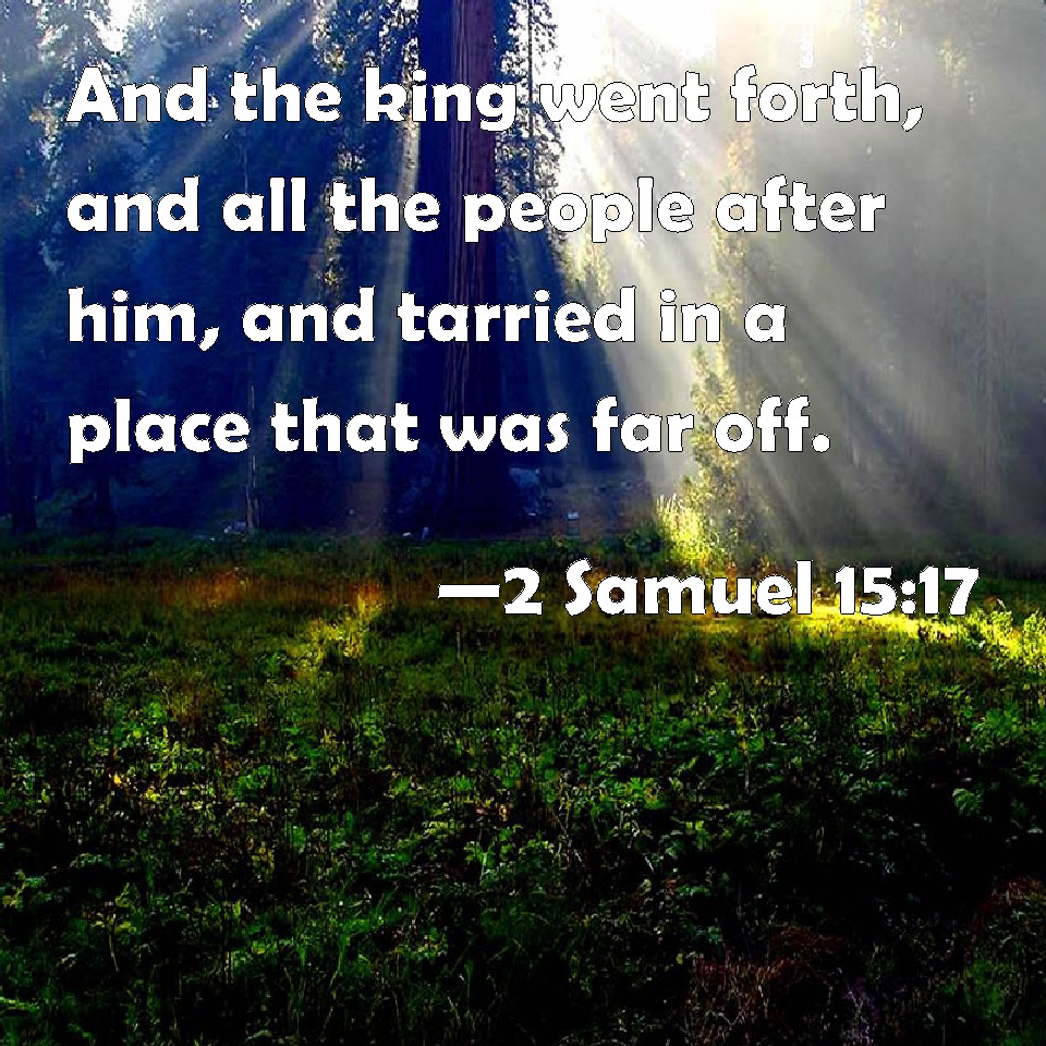 Choose a Background 2 Samuel 15:17 And the king went forth, and all the people after him, and tarried in a place that was far off. KJV: And the king went forth, and all the people after him, and tarried in a place that was far off. DRB: And the king going forth and all Israel on foot, stood afar off from the house: DBT: And the king went forth, and all the people after him, and stayed at the remote house. ERV: And the king went forth, and all the people after him; and they tarried in Beth-merhak. WBT: And the king went forth, and all the people after him, and tarried in a place that was far off. WEB: The king went forth, and all the people after him; and they stayed in Beth Merhak. YLT: And the king goeth out, and all the people at his feet, and they stand still at the farthest off house.Links 2 Samuel 15:17 NIV • 2 Samuel 15:17 NLT • 2 Samuel 15:17 ESV • 2 Samuel 15:17 NASB • 2 Samuel 15:17 KJV • 2 Samuel 15:17 Interlinear • 2 Samuel 15:17 Commentaries • 2 Samuel 15:17 Parallel Texts • 2 Samuel 15:17 Bible Apps • 2 Samuel 15:17 Parallel • Bible Hub |