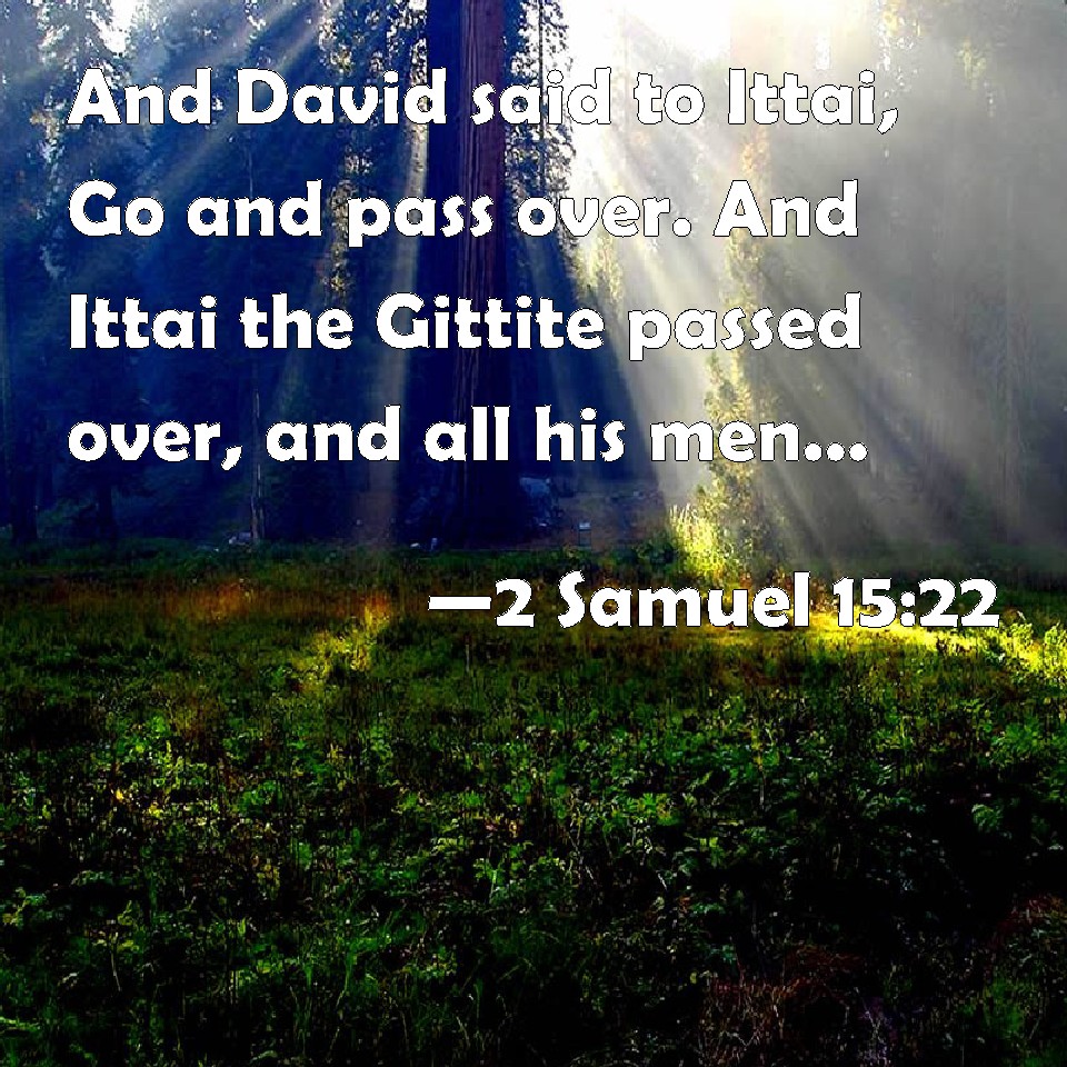 Choose a Background 2 Samuel 15:22 And David said to Ittai, Go and pass over. And Ittai the Gittite passed over, and all his men, and all the little ones that were with him. KJV: And David said to Ittai, Go and pass over. And Ittai the Gittite passed over, and all his men, and all the little ones that were with him. DRB: And David said to Ethai: Come, and pass over. And Ethai the Gethite passed, and all the men that were with him, and the rest of the people. DBT: And David said to Ittai, Go and pass over. And Ittai the Gittite passed over, and all his men, and all the little ones that were with him. ERV: And David said to Ittai, Go and pass over. And Ittai the Gittite passed over and all his men, and all the little ones that were with him. WBT: And David said to Ittai, Go and pass over. And Ittai the Gittite passed over, and all his men, and all the little ones that were with him. WEB: David said to Ittai, "Go and pass over." Ittai the Gittite passed over, and all his men, and all the little ones who were with him. YLT: And David saith unto Ittai, 'Go and pass over;' and Ittai the Gittite passeth over, and all his men, and all the infants who are with him.Links 2 Samuel 15:22 NIV • 2 Samuel 15:22 NLT • 2 Samuel 15:22 ESV • 2 Samuel 15:22 NASB • 2 Samuel 15:22 KJV • 2 Samuel 15:22 Interlinear • 2 Samuel 15:22 Commentaries • 2 Samuel 15:22 Parallel Texts • 2 Samuel 15:22 Bible Apps • 2 Samuel 15:22 Parallel • Bible Hub |