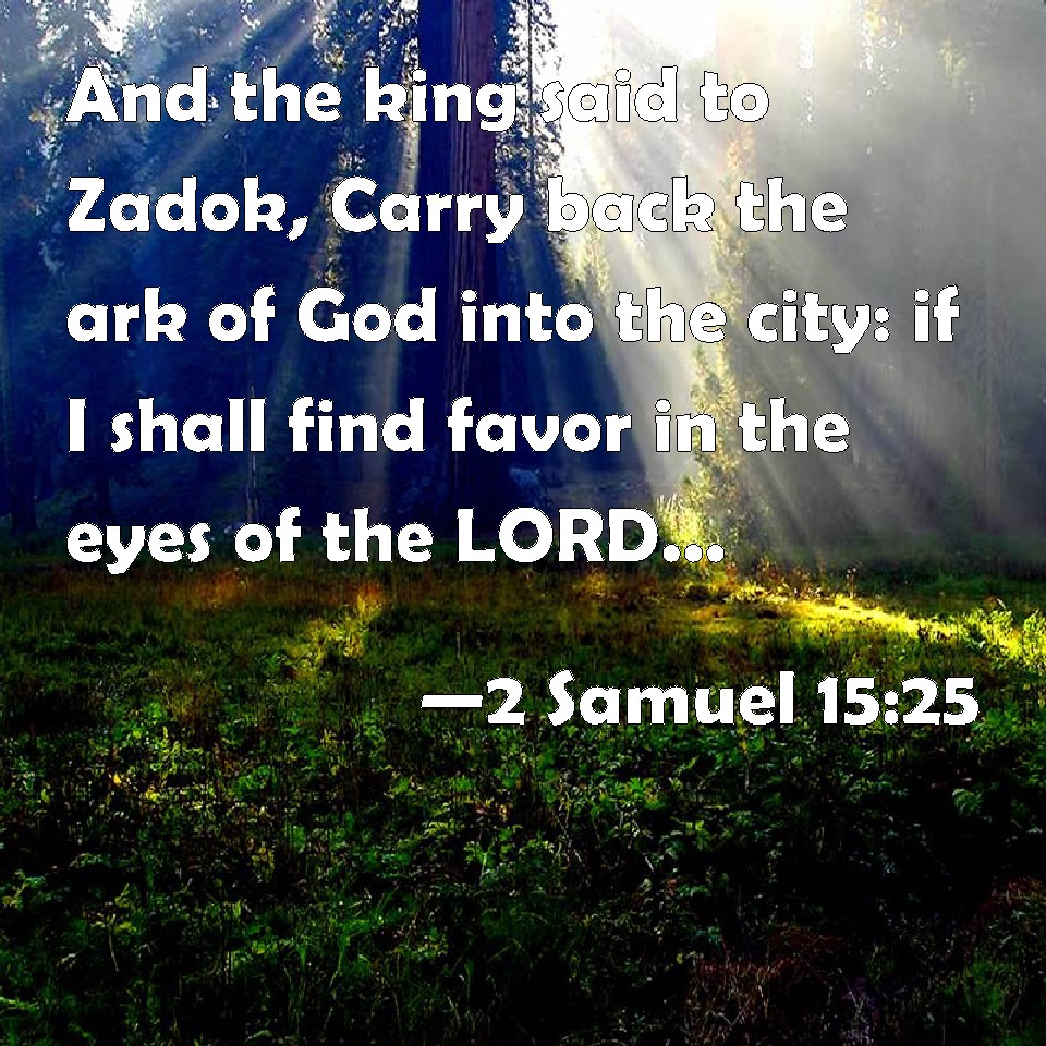 Choose a Background 2 Samuel 15:25 And the king said to Zadok, Carry back the ark of God into the city: if I shall find favor in the eyes of the LORD, he will bring me again, and show me both it, and his habitation: KJV: And the king said unto Zadok, Carry back the ark of God into the city: if I shall find favour in the eyes of the LORD, he will bring me again, and shew me both it, and his habitation: DRB: And the king said to Sadoc: Carry back the ark of God into the city: if I shall find grace in the sight of the Lord, he will bring me again, and he will shew me it, and his tabernacle. DBT: And the king said to Zadok, Carry back the ark of God into the city. If I shall find favour in the eyes of Jehovah, he will bring me again, and shew me it, and its habitation. ERV: And the king said unto Zadok, Carry back the ark of God into the city: if I shall find favour in the eyes of the LORD, he will bring me again, and shew me both it, and his habitation: WBT: And the king said to Zadok, Carry back the ark of God into the city: if I shall find favor in the eyes of the LORD, he will bring me again, and show me both it, and his habitation: WEB: The king said to Zadok, "Carry back the ark of God into the city. If I find favor in the eyes of Yahweh, he will bring me again, and show me both it, and his habitation; YLT: And the king saith to Zadok, 'Take back the ark of God to the city; if I find grace in the eyes of Jehovah, then He hath brought me back, and shewn me it and His habitation;Links 2 Samuel 15:25 NIV • 2 Samuel 15:25 NLT • 2 Samuel 15:25 ESV • 2 Samuel 15:25 NASB • 2 Samuel 15:25 KJV • 2 Samuel 15:25 Interlinear • 2 Samuel 15:25 Commentaries • 2 Samuel 15:25 Parallel Texts • 2 Samuel 15:25 Bible Apps • 2 Samuel 15:25 Parallel • Bible Hub |