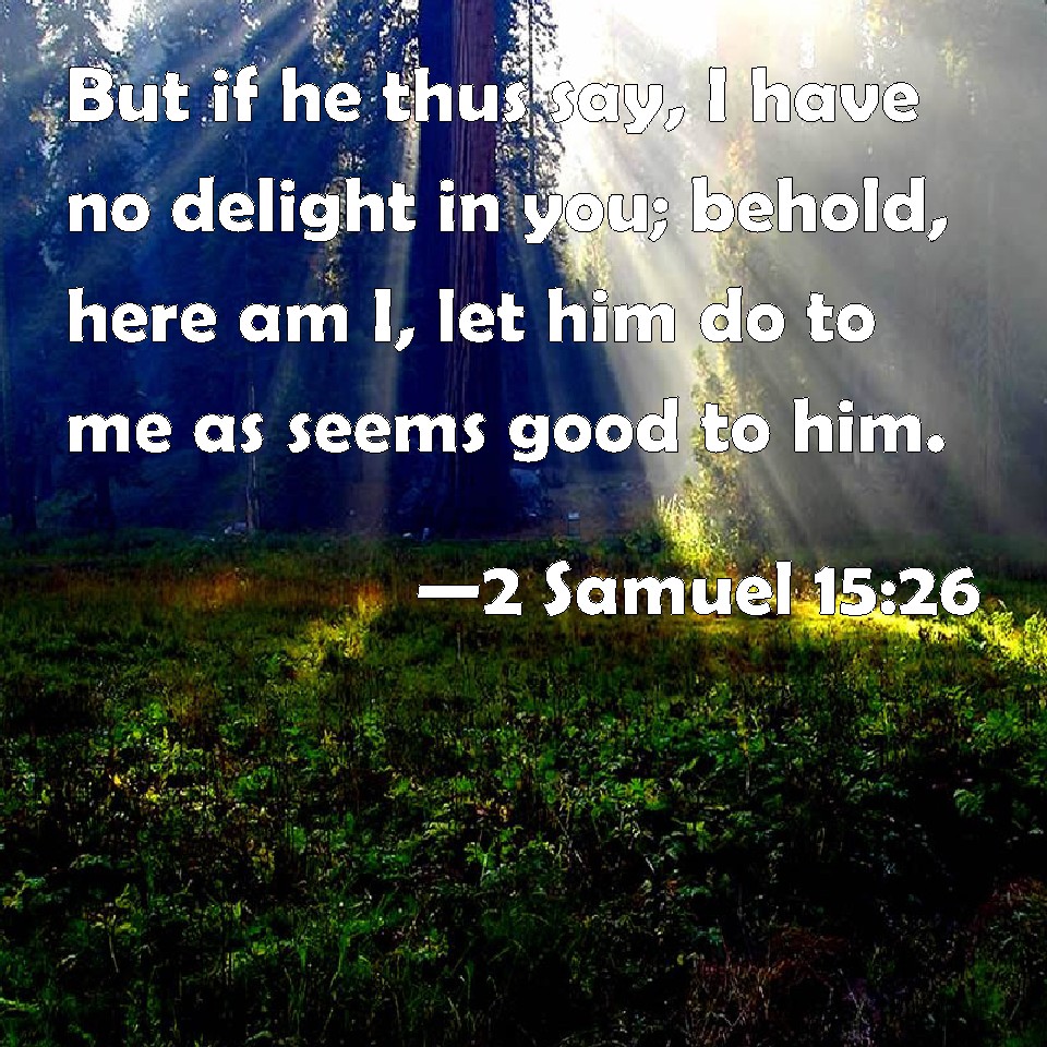 Choose a Background 2 Samuel 15:26 But if he thus say, I have no delight in you; behold, here am I, let him do to me as seems good to him. KJV: But if he thus say, I have no delight in thee; behold, here am I, let him do to me as seemeth good unto him. DRB: But if he shall say to me: Thou pleasest me not: I am ready, let him do that which is good before him. DBT: But if he thus say, I have no delight in thee; behold, here am I, let him do to me as seemeth good to him. ERV: but if he say thus, I have no delight in thee; behold, here am I, let him do to me as seemeth good unto him. WBT: But if he shall thus say, I have no delight in thee; behold, here am I, let him do to me as seemeth good to him. WEB: but if he say thus, 'I have no delight in you;' behold, here am I. Let him do to me as seems good to him." YLT: and if thus He say, I have not delighted in thee; here am I, He doth to me as is good in His eyes.'Links 2 Samuel 15:26 NIV • 2 Samuel 15:26 NLT • 2 Samuel 15:26 ESV • 2 Samuel 15:26 NASB • 2 Samuel 15:26 KJV • 2 Samuel 15:26 Interlinear • 2 Samuel 15:26 Commentaries • 2 Samuel 15:26 Parallel Texts • 2 Samuel 15:26 Bible Apps • 2 Samuel 15:26 Parallel • Bible Hub |