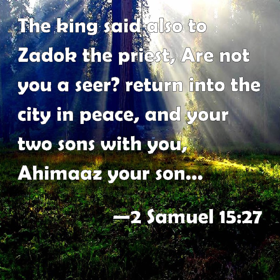 Choose a Background 2 Samuel 15:27 The king said also to Zadok the priest, Are not you a seer? return into the city in peace, and your two sons with you, Ahimaaz your son, and Jonathan the son of Abiathar. KJV: The king said also unto Zadok the priest, Art not thou a seer? return into the city in peace, and your two sons with you, Ahimaaz thy son, and Jonathan the son of Abiathar. DRB: And the king said to Sadoc the priest: O seer, return into the city in peace: and let Achimaas thy son, and Jonathan the son of Abiathar, your two sons, be with you. DBT: And the king said to Zadok the priest, Thou art the seer: return into the city in peace, and your two sons with you, Ahimaaz thy son, and Jonathan the son of Abiathar. ERV: The king said also unto Zadok the priest, Art thou not a seer? return into the city in peace, and your two sons with you, Ahimaaz thy son, and Jonathan the son of Abiathar. WBT: The king said also to Zadok the priest, Art not thou a seer? return into the city in peace, and your two sons with you, Ahimaaz thy son, and Jonathan the son of Abiathar. WEB: The king said also to Zadok the priest, "Aren't you a seer? Return into the city in peace, and your two sons with you, Ahimaaz your son, and Jonathan the son of Abiathar. YLT: And the king saith unto Zadok the priest, 'Art thou a seer? turn back to the city in peace, and Ahimaaz thy son, and Jonathan son of Abiathar, your two sons with you;Links 2 Samuel 15:27 NIV • 2 Samuel 15:27 NLT • 2 Samuel 15:27 ESV • 2 Samuel 15:27 NASB • 2 Samuel 15:27 KJV • 2 Samuel 15:27 Interlinear • 2 Samuel 15:27 Commentaries • 2 Samuel 15:27 Parallel Texts • 2 Samuel 15:27 Bible Apps • 2 Samuel 15:27 Parallel • Bible Hub |