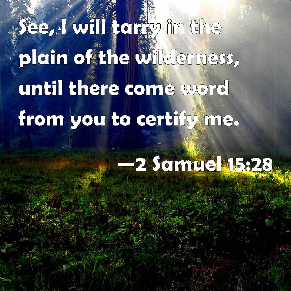 Choose a Background 2 Samuel 15:28 See, I will tarry in the plain of the wilderness, until there come word from you to certify me. KJV: See, I will tarry in the plain of the wilderness, until there come word from you to certify me. DRB: Behold I will lie hid in the plains of the wilderness, till there come word from you to certify me. DBT: See, I will stop in the plains of the desert, until there come word from you to inform me. ERV: See, I will tarry at the fords of the wilderness, until there come word from you to certify me. WBT: See, I will tarry in the plain of the wilderness, until word shall come from you to certify me. WEB: Behold, I will stay at the fords of the wilderness, until word comes from you to inform me." YLT: see ye, I am tarrying in the plains of the wilderness till the coming in of a word from you to declare to me.'Links 2 Samuel 15:28 NIV • 2 Samuel 15:28 NLT • 2 Samuel 15:28 ESV • 2 Samuel 15:28 NASB • 2 Samuel 15:28 KJV • 2 Samuel 15:28 Interlinear • 2 Samuel 15:28 Commentaries • 2 Samuel 15:28 Parallel Texts • 2 Samuel 15:28 Bible Apps • 2 Samuel 15:28 Parallel • Bible Hub |
