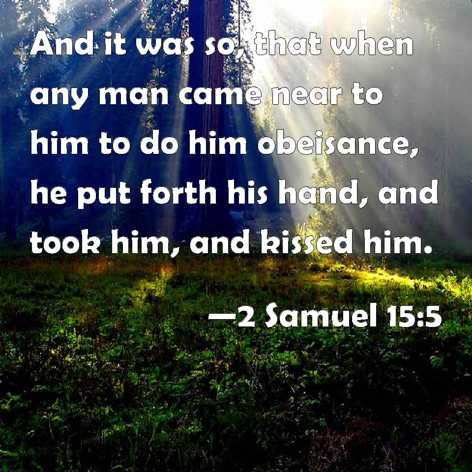 Choose a Background 2 Samuel 15:5 And it was so, that when any man came near to him to do him obeisance, he put forth his hand, and took him, and kissed him. KJV: And it was so, that when any man came nigh to him to do him obeisance, he put forth his hand, and took him, and kissed him. DRB: Moreover when any man came to him to salute him, he put forth his hand, and took him, and kissed him. DBT: And it was so, that when any man came near to do him obeisance, he put forth his hand, and took him, and kissed him. ERV: And it was so, that when any man came nigh to do him obeisance, he put forth his hand, and took hold of him, and kissed him. WBT: And it was so, that when any man came nigh to him to do him obeisance, he put forth his hand, and took him, and kissed him. WEB: It was so, that when any man came near to do him obeisance, he put forth his hand, and took hold of him, and kissed him. YLT: And it hath come to pass, in the drawing nearing of any one to bow himself to him, that he hath put forth his hand, and laid hold on him, and given a kiss to him;Links 2 Samuel 15:5 NIV • 2 Samuel 15:5 NLT • 2 Samuel 15:5 ESV • 2 Samuel 15:5 NASB • 2 Samuel 15:5 KJV • 2 Samuel 15:5 Interlinear • 2 Samuel 15:5 Commentaries • 2 Samuel 15:5 Parallel Texts • 2 Samuel 15:5 Bible Apps • 2 Samuel 15:5 Parallel • Bible Hub |