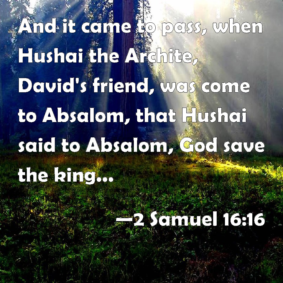Choose a Background 2 Samuel 16:16 And it came to pass, when Hushai the Archite, David's friend, was come to Absalom, that Hushai said to Absalom, God save the king, God save the king. KJV: And it came to pass, when Hushai the Archite, David's friend, was come unto Absalom, that Hushai said unto Absalom, God save the king, God save the king. DRB: And when Chusai the Arachite, David's friend, was come to Absalom, he said to him: God save thee, O king, God save thee, O king. DBT: And it came to pass, when Hushai the Archite, David's friend, came to Absalom, that Hushai said to Absalom, Long live the king! Long live the king! ERV: And it came to pass, when Hushai the Archite, David's friend, was come unto Absalom, that Hushai said unto Absalom, God save the king, God save the king. WBT: And it came to pass, when Hushai the Archite, David's friend, had come to Absalom, that Hushai said to Absalom, God save the king, God save the king. WEB: It happened, when Hushai the Archite, David's friend, had come to Absalom, that Hushai said to Absalom, "Long live the king! Long live the king!" YLT: and it cometh to pass, when Hushai the Archite, David's friend, hath come unto Absalom, that Hushai saith unto Absalom, 'Let the king live! let the king live!'Links 2 Samuel 16:16 NIV • 2 Samuel 16:16 NLT • 2 Samuel 16:16 ESV • 2 Samuel 16:16 NASB • 2 Samuel 16:16 KJV • 2 Samuel 16:16 Interlinear • 2 Samuel 16:16 Commentaries • 2 Samuel 16:16 Parallel Texts • 2 Samuel 16:16 Bible Apps • 2 Samuel 16:16 Parallel • Bible Hub |