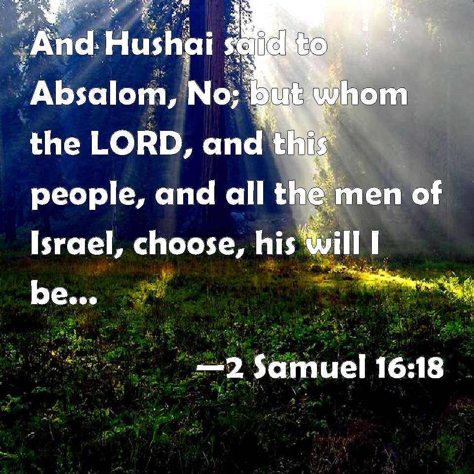 Choose a Background 2 Samuel 16:18 And Hushai said to Absalom, No; but whom the LORD, and this people, and all the men of Israel, choose, his will I be, and with him will I abide. KJV: And Hushai said unto Absalom, Nay; but whom the LORD, and this people, and all the men of Israel, choose, his will I be, and with him will I abide. DRB: And Chusai answered Absalom: Nay: for I will be his, whom the Lord hath chosen, and all this people, and all Israel, and with him will I abide. DBT: And Hushai said to Absalom, No; but whom Jehovah, and this people, and all the men of Israel choose, his will I be, and with him will I abide. ERV: And Hushai said unto Absalom, Nay; but whom the LORD, and this people, and all the men of Israel have chosen, his will I be, and with him will I abide. WBT: And Hushai said to Absalom, Nay; but whom the LORD, and this people, and all the men of Israel choose, his will I be, and with him will I abide. WEB: Hushai said to Absalom, "No; but whoever Yahweh, and this people, and all the men of Israel have chosen, his will I be, and with him I will stay. YLT: And Hushai saith unto Absalom, 'Nay, for he whom Jehovah hath chosen, and this people, even all the men of Israel, his I am, and with him I abide;Links 2 Samuel 16:18 NIV • 2 Samuel 16:18 NLT • 2 Samuel 16:18 ESV • 2 Samuel 16:18 NASB • 2 Samuel 16:18 KJV • 2 Samuel 16:18 Interlinear • 2 Samuel 16:18 Commentaries • 2 Samuel 16:18 Parallel Texts • 2 Samuel 16:18 Bible Apps • 2 Samuel 16:18 Parallel • Bible Hub |