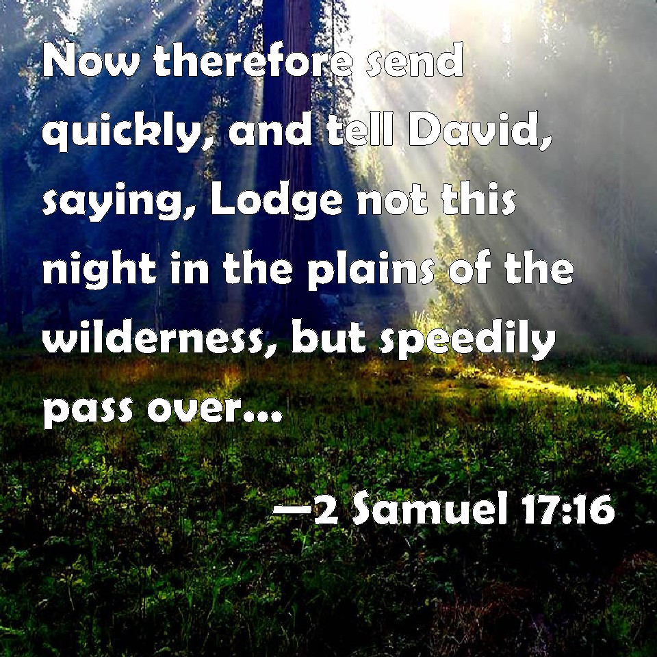 Choose a Background 2 Samuel 17:16 Now therefore send quickly, and tell David, saying, Lodge not this night in the plains of the wilderness, but speedily pass over; lest the king be swallowed up, and all the people that are with him. KJV: Now therefore send quickly, and tell David, saying, Lodge not this night in the plains of the wilderness, but speedily pass over; lest the king be swallowed up, and all the people that are with him. DRB: Now therefore send quickly, and tell David, saying: Tarry not this night in the plains of the wilderness, but without delay pass over: lest the king be swallowed up, and all the people that is with him. DBT: And now send quickly, and tell David saying, Lodge not this night in the plains of the wilderness, but speedily pass over; lest the king be swallowed up, and all the people that are with him. ERV: Now therefore send quickly, and tell David, saying, Lodge not this night at the fords of the wilderness, but in any wise pass over; lest the king be swallowed up, and all the people that are with him. WBT: Now therefore send quickly, and tell David, saying, Lodge not this night in the plains of the wilderness, but speedily pass over; lest the king be swallowed up, and all the people that are with him. WEB: Now therefore send quickly, and tell David, saying, 'Don't lodge this night at the fords of the wilderness, but by all means pass over; lest the king be swallowed up, and all the people who are with him.'" YLT: and now, send hastily, and declare to David, saying, Lodge not to-night in the plains of the wilderness, and also, certainly pass over, lest there be a swallowing up of the king and of all the people who are with him.'Links 2 Samuel 17:16 NIV • 2 Samuel 17:16 NLT • 2 Samuel 17:16 ESV • 2 Samuel 17:16 NASB • 2 Samuel 17:16 KJV • 2 Samuel 17:16 Interlinear • 2 Samuel 17:16 Commentaries • 2 Samuel 17:16 Parallel Texts • 2 Samuel 17:16 Bible Apps • 2 Samuel 17:16 Parallel • Bible Hub |