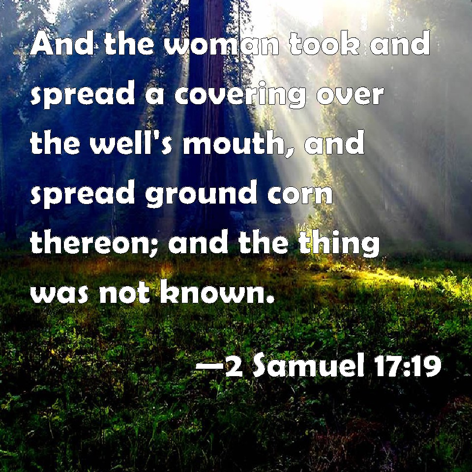 Choose a Background 2 Samuel 17:19 And the woman took and spread a covering over the well's mouth, and spread ground corn thereon; and the thing was not known. KJV: And the woman took and spread a covering over the well's mouth, and spread ground corn thereon; and the thing was not known. DRB: And a woman took, and spread a covering over the mouth of the well, as it were to dry sodden barley: and so the thing was not known. DBT: And the woman took and spread the covering over the well's mouth, and spread ground corn on it; and the thing was not known. ERV: And the woman took and spread the covering over the well's mouth, and strewed bruised corn thereon; and nothing was known. WBT: And the woman took and spread a covering over the well's mouth, and spread ground corn upon it; and the thing was not known. WEB: The woman took and spread the covering over the well's mouth, and spread out bruised grain on it; and nothing was known. YLT: and the woman taketh and spreadeth the covering over the face of the well, and spreadeth on it the ground corn, and the thing hath not been known.Links 2 Samuel 17:19 NIV • 2 Samuel 17:19 NLT • 2 Samuel 17:19 ESV • 2 Samuel 17:19 NASB • 2 Samuel 17:19 KJV • 2 Samuel 17:19 Interlinear • 2 Samuel 17:19 Commentaries • 2 Samuel 17:19 Parallel Texts • 2 Samuel 17:19 Bible Apps • 2 Samuel 17:19 Parallel • Bible Hub |