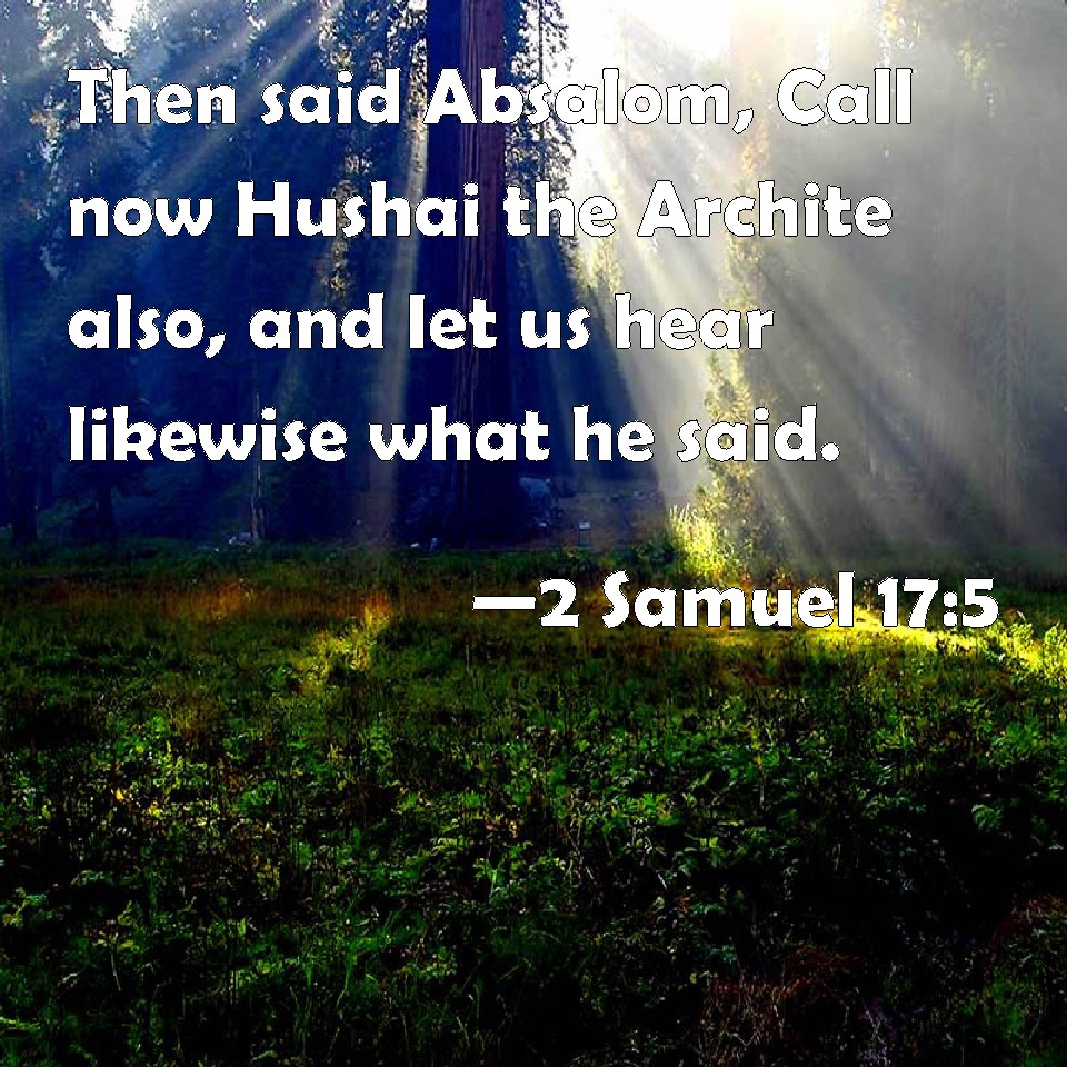 Choose a Background 2 Samuel 17:5 Then said Absalom, Call now Hushai the Archite also, and let us hear likewise what he said. KJV: Then said Absalom, Call now Hushai the Archite also, and let us hear likewise what he saith. DRB: But Absalom said: Call Chusai the Arachite, and let us hear what he also saith. DBT: And Absalom said, Call now Hushai the Archite also, and we will hear also what he says. ERV: Then said Absalom, Call now Hushai the Archite also, and let us hear likewise what he saith. WBT: Then said Absalom, Call now Hushai the Archite also, and let us hear likewise what he saith. WEB: Then Absalom said, "Now call Hushai the Archite also, and let us hear likewise what he says." YLT: And Absalom saith, 'Call, I pray thee, also for Hushai the Archite, and we hear what is in his mouth — even he.'Links 2 Samuel 17:5 NIV • 2 Samuel 17:5 NLT • 2 Samuel 17:5 ESV • 2 Samuel 17:5 NASB • 2 Samuel 17:5 KJV • 2 Samuel 17:5 Interlinear • 2 Samuel 17:5 Commentaries • 2 Samuel 17:5 Parallel Texts • 2 Samuel 17:5 Bible Apps • 2 Samuel 17:5 Parallel • Bible Hub |