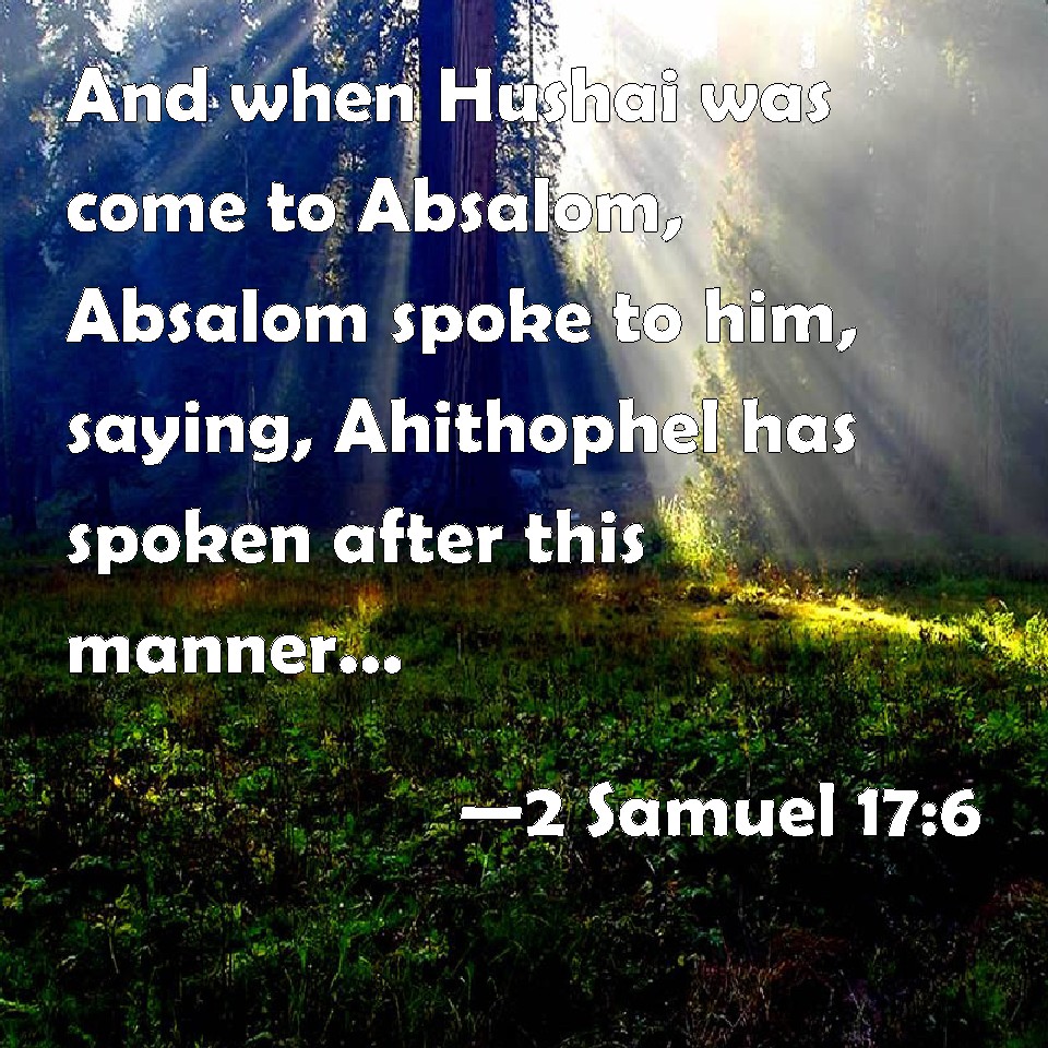 Choose a Background 2 Samuel 17:6 And when Hushai was come to Absalom, Absalom spoke to him, saying, Ahithophel has spoken after this manner: shall we do after his saying? if not; speak you. KJV: And when Hushai was come to Absalom, Absalom spake unto him, saying, Ahithophel hath spoken after this manner: shall we do after his saying? if not; speak thou. DRB: And when Chusai was come to Absalom, Absalom said to him: Achitophel hath spoken after this manner: shall we do it or not? what counsel dost thou give? DBT: And Hushai came to Absalom, and Absalom spoke to him saying, Ahithophel has spoken after this manner: shall we carry out his word? If not, speak thou. ERV: And when Hushai was come to Absalom, Absalom spake unto him, saying, Ahithophel hath spoken after this manner: shall we do after his saying? if not, speak thou. WBT: And when Hushai had come to Absalom, Absalom spoke to him, saying, Ahithophel hath spoken after this manner: shall we do after his saying? if not, speak thou. WEB: When Hushai was come to Absalom, Absalom spoke to him, saying, "Ahithophel has spoken like this. Shall we do what he says? If not, speak up." YLT: And Hushai cometh in unto Absalom, and Absalom speaketh unto him, saying, 'According to this word hath Ahithophel spoken; do we do his word? if not, thou — speak thou.'Links 2 Samuel 17:6 NIV • 2 Samuel 17:6 NLT • 2 Samuel 17:6 ESV • 2 Samuel 17:6 NASB • 2 Samuel 17:6 KJV • 2 Samuel 17:6 Interlinear • 2 Samuel 17:6 Commentaries • 2 Samuel 17:6 Parallel Texts • 2 Samuel 17:6 Bible Apps • 2 Samuel 17:6 Parallel • Bible Hub |