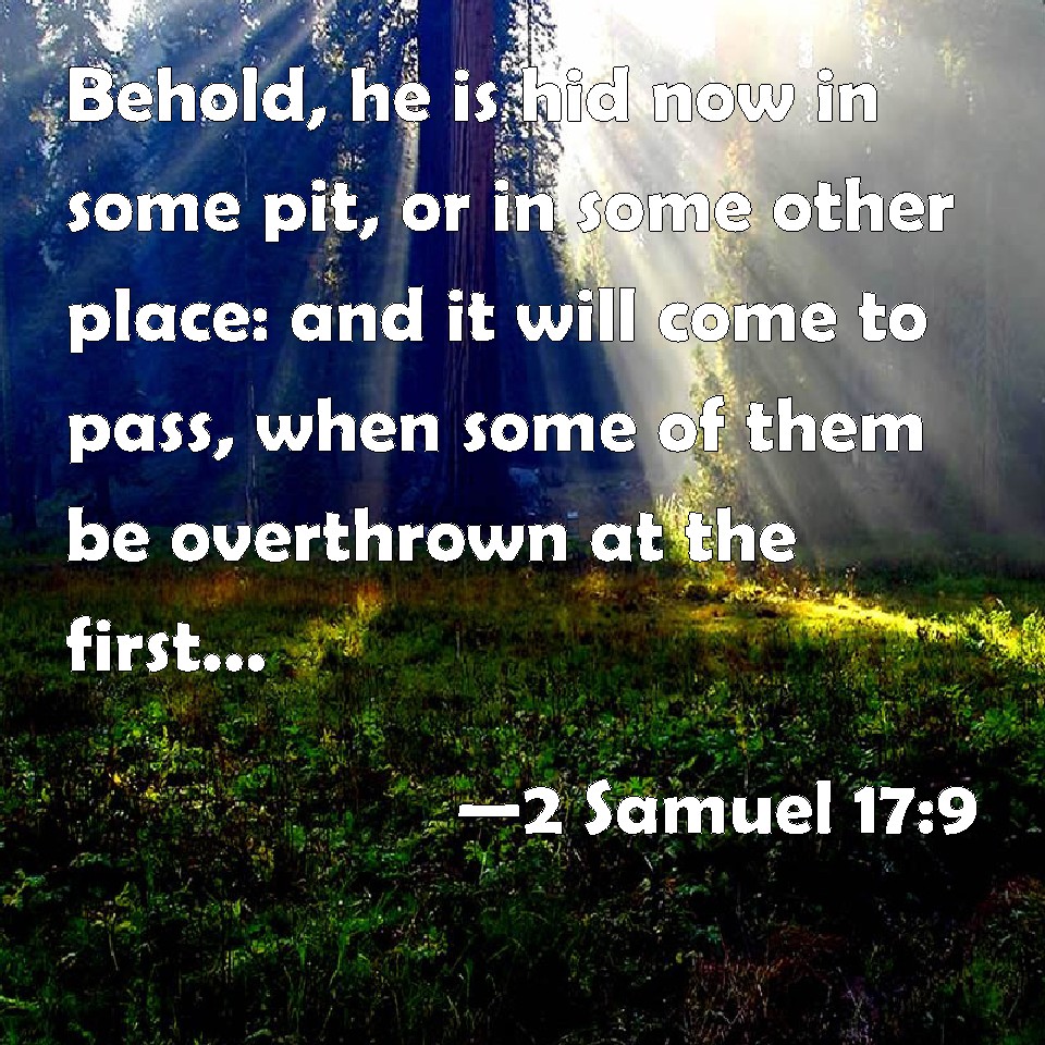 Choose a Background 2 Samuel 17:9 Behold, he is hid now in some pit, or in some other place: and it will come to pass, when some of them be overthrown at the first, that whoever hears it will say, There is a slaughter among the people that follow Absalom. KJV: Behold, he is hid now in some pit, or in some other place: and it will come to pass, when some of them be overthrown at the first, that whosoever heareth it will say, There is a slaughter among the people that follow Absalom. DRB: Perhaps he now lieth hid in pits, or in some other place where he list: and when any one shall fall at the first, every one that heareth it shall say: There is a slaughter among the people that followed Absalom. DBT: Behold, he is hid now in some pit, or some such place; and it will come to pass, when some of them fall at the first, whoever heareth it will say, There has been slaughter among the people that follow Absalom, ERV: Behold, he is hid now in some pit, or in some other place: and it will come to pass, when some of them be fallen at the first, that whosoever heareth it will say, There is a slaughter among the people that follow Absalom. WBT: Behold, he is hid now in some pit, or in some other place: and it will come to pass, when some of them are overthrown at the first, that whosoever heareth it will say, There is a slaughter among the people that follow Absalom. WEB: Behold, he is now hidden in some pit, or in some other place. It will happen, when some of them have fallen at the first, that whoever hears it will say, 'There is a slaughter among the people who follow Absalom!' YLT: lo, now, he is hidden in one of the pits, or in one of the places, and it hath been, at the falling among them at the commencement, that the hearer hath heard, and said, There hath been a slaughter among the people who are after Absalom;Links 2 Samuel 17:9 NIV • 2 Samuel 17:9 NLT • 2 Samuel 17:9 ESV • 2 Samuel 17:9 NASB • 2 Samuel 17:9 KJV • 2 Samuel 17:9 Interlinear • 2 Samuel 17:9 Commentaries • 2 Samuel 17:9 Parallel Texts • 2 Samuel 17:9 Bible Apps • 2 Samuel 17:9 Parallel • Bible Hub |