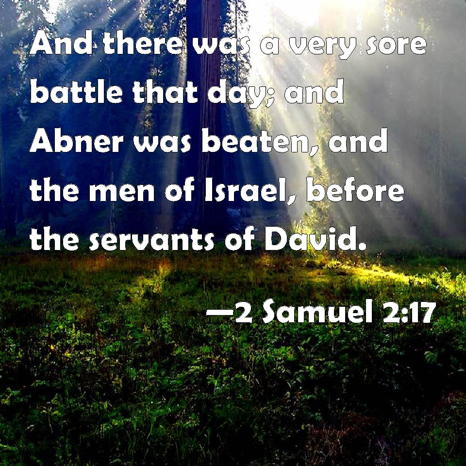Choose a Background 2 Samuel 2:17 And there was a very sore battle that day; and Abner was beaten, and the men of Israel, before the servants of David. KJV: And there was a very sore battle that day; and Abner was beaten, and the men of Israel, before the servants of David. DRB: And there was a very fierce battle that day: and Abner was put to flight, with the men of Israel, by the servants of David. DBT: And the battle that day was very severe; and Abner and the men of Israel were routed before the servants of David. ERV: And the battle was very sore that day; and Abner was beaten, and the men of Israel, before the servants of David. WBT: And there was a very severe battle that day; and Abner was defeated, and the men of Israel, before the servants of David. WEB: The battle was very severe that day: and Abner was beaten, and the men of Israel, before the servants of David. YLT: and the battle is very hard on that day, and Abner is smitten, and the men of Israel, before the servants of David.Links 2 Samuel 2:17 NIV • 2 Samuel 2:17 NLT • 2 Samuel 2:17 ESV • 2 Samuel 2:17 NASB • 2 Samuel 2:17 KJV • 2 Samuel 2:17 Interlinear • 2 Samuel 2:17 Commentaries • 2 Samuel 2:17 Parallel Texts • 2 Samuel 2:17 Bible Apps • 2 Samuel 2:17 Parallel • Bible Hub |