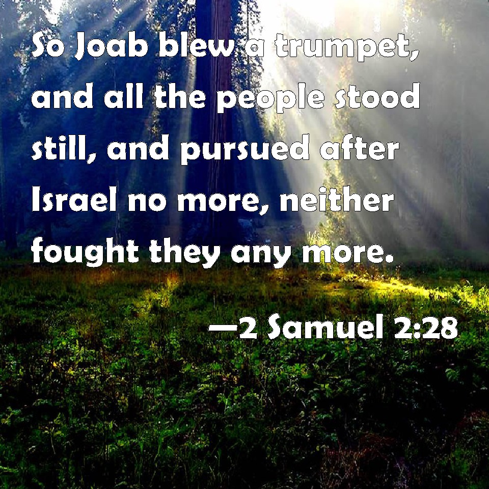 Choose a Background 2 Samuel 2:28 So Joab blew a trumpet, and all the people stood still, and pursued after Israel no more, neither fought they any more. KJV: So Joab blew a trumpet, and all the people stood still, and pursued after Israel no more, neither fought they any more. DRB: Then Joab sounded the trumpet, and all the army stood still, and did not pursue after Israel any farther, nor fight any more. DBT: And Joab blew the trumpet, and all the people stood still, and pursued after Israel no more, neither did they fight any more. ERV: So Joab blew the trumpet, and all the people stood still, and pursued after Israel no more, neither fought they any more. WBT: So Joab blew a trumpet, and all the people stood still, and pursued Israel no more, neither fought they any more. WEB: So Joab blew the trumpet; and all the people stood still, and pursued after Israel no more, neither fought they any more. YLT: And Joab bloweth with a trumpet, and all the people stand still, and pursue no more after Israel, nor have they added any more to fight.Links 2 Samuel 2:28 NIV • 2 Samuel 2:28 NLT • 2 Samuel 2:28 ESV • 2 Samuel 2:28 NASB • 2 Samuel 2:28 KJV • 2 Samuel 2:28 Interlinear • 2 Samuel 2:28 Commentaries • 2 Samuel 2:28 Parallel Texts • 2 Samuel 2:28 Bible Apps • 2 Samuel 2:28 Parallel • Bible Hub |