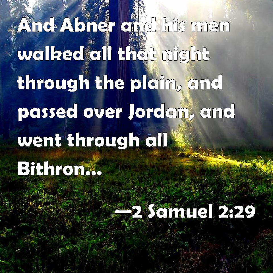Choose a Background 2 Samuel 2:29 And Abner and his men walked all that night through the plain, and passed over Jordan, and went through all Bithron, and they came to Mahanaim. KJV: And Abner and his men walked all that night through the plain, and passed over Jordan, and went through all Bithron, and they came to Mahanaim. DRB: And Abner and his men walked all that night through the plains: and they passed the Jordan, and having gone through all Beth-horon, came to the camp. DBT: And Abner and his men walked all that night through the plain, and passed over the Jordan, and went through all Bithron, and they came to Mahanaim. ERV: And Abner and his men went all that night through the Arabah; and they passed over Jordan, and went through all Bithron, and came to Mahanaim. WBT: And Abner and his men walked all that night through the plain, and passed over Jordan, and went through all Bithron, and they came to Mahanaim. WEB: Abner and his men went all that night through the Arabah; and they passed over the Jordan, and went through all Bithron, and came to Mahanaim. YLT: And Abner and his men have gone through the plain all that night, and pass over the Jordan, and go on through all Bithron, and come in to Mahanaim.Links 2 Samuel 2:29 NIV • 2 Samuel 2:29 NLT • 2 Samuel 2:29 ESV • 2 Samuel 2:29 NASB • 2 Samuel 2:29 KJV • 2 Samuel 2:29 Interlinear • 2 Samuel 2:29 Commentaries • 2 Samuel 2:29 Parallel Texts • 2 Samuel 2:29 Bible Apps • 2 Samuel 2:29 Parallel • Bible Hub |