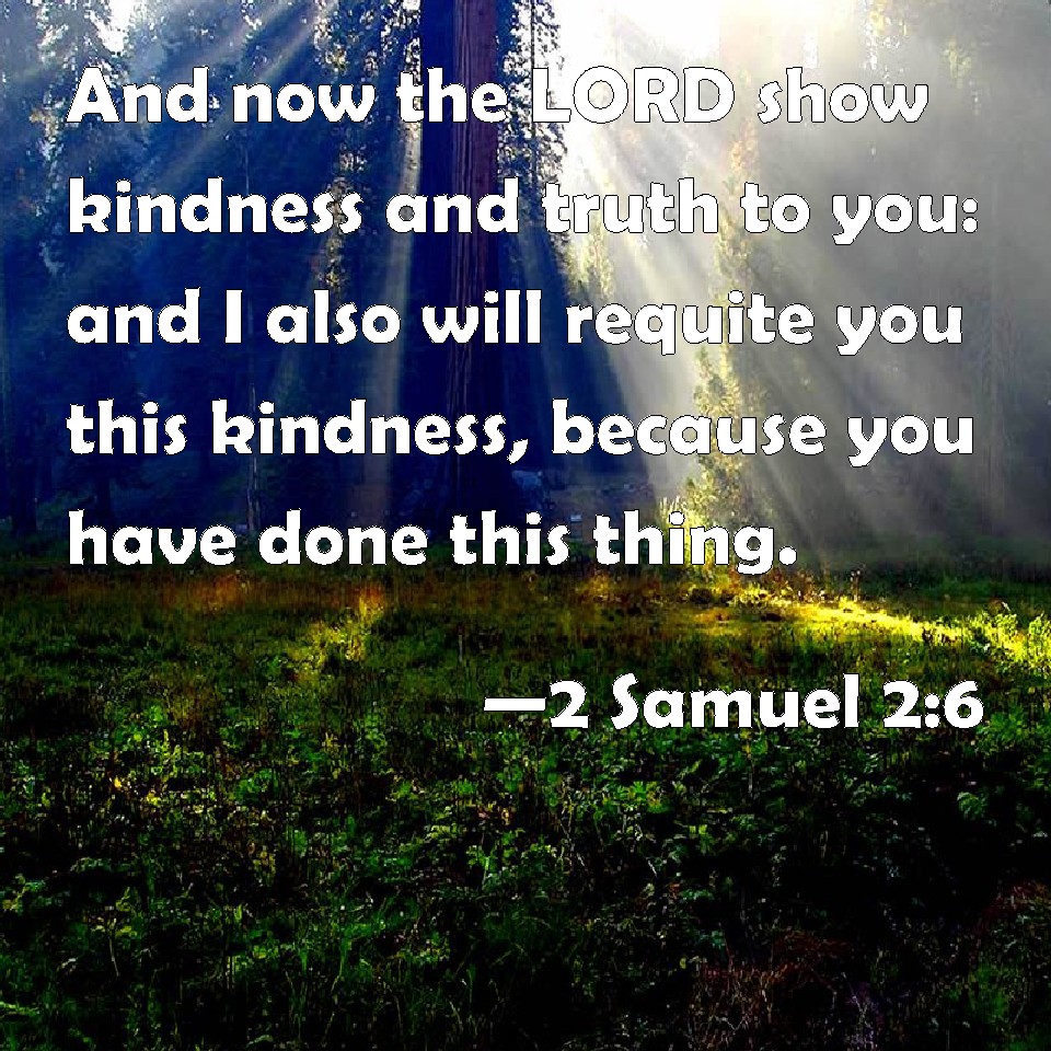 Choose a Background 2 Samuel 2:6 And now the LORD show kindness and truth to you: and I also will requite you this kindness, because you have done this thing. KJV: And now the LORD shew kindness and truth unto you: and I also will requite you this kindness, because ye have done this thing. DRB: And now the Lord surely will render you mercy and truth, and I also will, requite you for this good turn, because you have done this thing. DBT: And now Jehovah shew kindness and faithfulness to you; and I also will requite you this good, because ye have done this thing. ERV: And now the LORD shew kindness and truth unto you: and I also will requite you this kindness, because ye have done this thing. WBT: And now the LORD show kindness and truth to you: and I also will requite you this kindness, because ye have done this thing. WEB: Now may Yahweh show loving kindness and truth to you. I also will reward you for this kindness, because you have done this thing. YLT: 'And, now, Jehovah doth with you kindness and truth, and also, I do with you this good because ye have done this thing;Links 2 Samuel 2:6 NIV • 2 Samuel 2:6 NLT • 2 Samuel 2:6 ESV • 2 Samuel 2:6 NASB • 2 Samuel 2:6 KJV • 2 Samuel 2:6 Interlinear • 2 Samuel 2:6 Commentaries • 2 Samuel 2:6 Parallel Texts • 2 Samuel 2:6 Bible Apps • 2 Samuel 2:6 Parallel • Bible Hub |