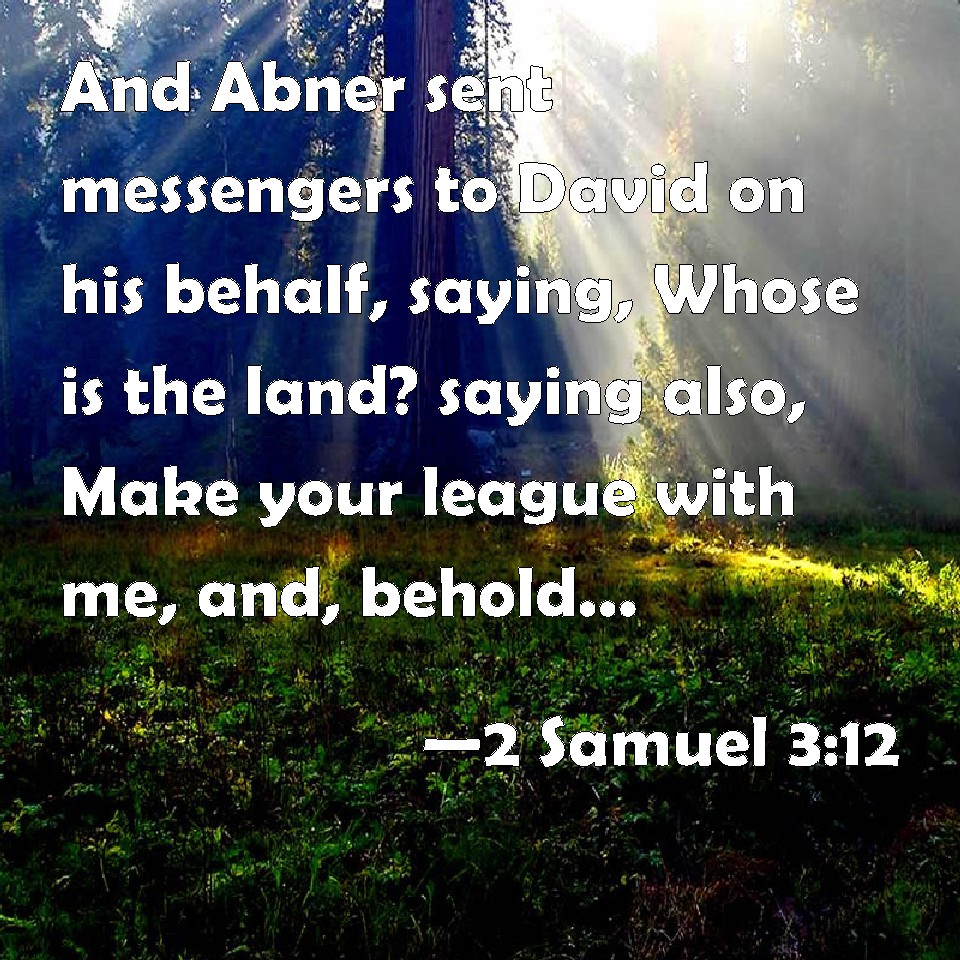 Choose a Background 2 Samuel 3:12 And Abner sent messengers to David on his behalf, saying, Whose is the land? saying also, Make your league with me, and, behold, my hand shall be with you, to bring about all Israel to you. KJV: And Abner sent messengers to David on his behalf, saying, Whose is the land? saying also, Make thy league with me, and, behold, my hand shall be with thee, to bring about all Israel unto thee. DRB: Abner therefore sent messengers to David for himself, saying: Whose is the land? and that they should say: Make a league with me, and my hand shall be with thee: and I will bring all Israel to thee. DBT: And Abner sent messengers to David on his behalf, saying, Whose is the land? saying also, Make thy covenant with me, and behold, my hand shall be with thee, to turn all Israel to thee. ERV: And Abner sent messengers to David on his behalf, saying, Whose is the land? saying also, Make thy league with me, and, behold, my hand shall be with thee, to bring about all Israel unto thee. WBT: And Abner sent messengers to David on his behalf, saying, Whose is the land? saying also, Make thy league with me, and behold, my hand shall be with thee, to bring about all Israel to thee. WEB: Abner sent messengers to David on his behalf, saying, "Whose is the land?" and saying, "Make your alliance with me, and behold, my hand shall be with you, to bring all Israel around to you." YLT: And Abner sendeth messengers unto David for himself, saying, 'Whose is the land?' saying, 'Make thy covenant with me, and lo, my hand is with thee, to bring round unto thee all Israel.'Links 2 Samuel 3:12 NIV • 2 Samuel 3:12 NLT • 2 Samuel 3:12 ESV • 2 Samuel 3:12 NASB • 2 Samuel 3:12 KJV • 2 Samuel 3:12 Interlinear • 2 Samuel 3:12 Commentaries • 2 Samuel 3:12 Parallel Texts • 2 Samuel 3:12 Bible Apps • 2 Samuel 3:12 Parallel • Bible Hub |
