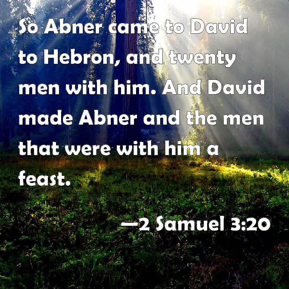 Choose a Background 2 Samuel 3:20 So Abner came to David to Hebron, and twenty men with him. And David made Abner and the men that were with him a feast. KJV: So Abner came to David to Hebron, and twenty men with him. And David made Abner and the men that were with him a feast. DRB: And he came to David in Hebron with twenty men: and David made a feast for Abner, and his men that came with him. DBT: So Abner came to David to Hebron, and twenty men with him. And David made Abner and the men that were with him a repast. ERV: So Abner came to David to Hebron, and twenty men with him. And David made Abner and the men that were with him a feast. WBT: So Abner came to David in Hebron, and twenty men with him: and David made Abner and the men that were with him, a feast. WEB: So Abner came to David to Hebron, and twenty men with him. David made Abner and the men who were with him a feast. YLT: and Abner cometh in unto David, to Hebron, and with him twenty men, and David maketh for Abner, and for the men who are with him, a banquet.Links 2 Samuel 3:20 NIV • 2 Samuel 3:20 NLT • 2 Samuel 3:20 ESV • 2 Samuel 3:20 NASB • 2 Samuel 3:20 KJV • 2 Samuel 3:20 Interlinear • 2 Samuel 3:20 Commentaries • 2 Samuel 3:20 Parallel Texts • 2 Samuel 3:20 Bible Apps • 2 Samuel 3:20 Parallel • Bible Hub |