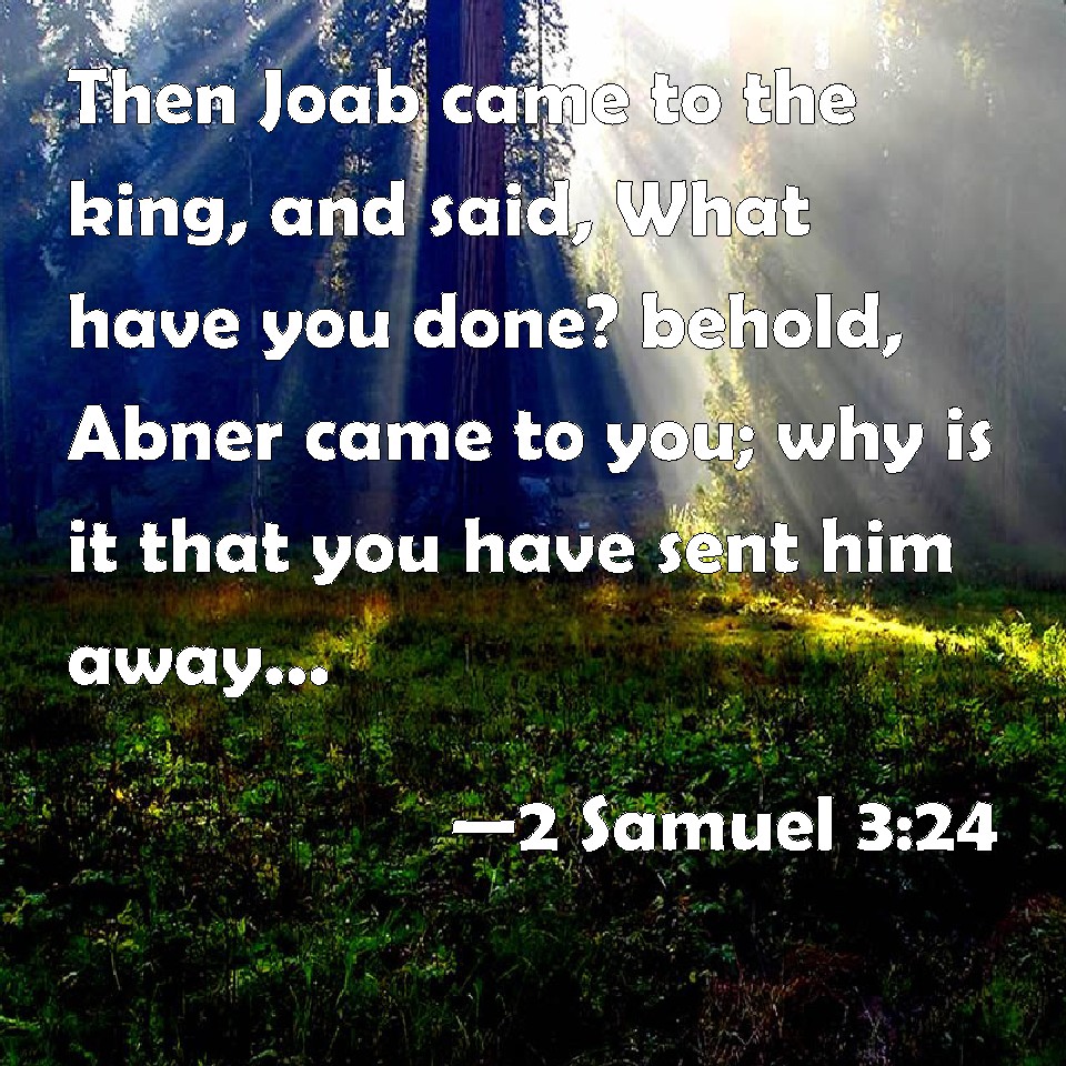 Choose a Background 2 Samuel 3:24 Then Joab came to the king, and said, What have you done? behold, Abner came to you; why is it that you have sent him away, and he is quite gone? KJV: Then Joab came to the king, and said, What hast thou done? behold, Abner came unto thee; why is it that thou hast sent him away, and he is quite gone? DRB: And Joab went in to the king, and said: What hast thou done? Behold Abner came to thee: Why didst thou send him away, and he is gone and departed? DBT: Then Joab came to the king, and said, What hast thou done? behold, Abner came to thee; why is it that thou hast sent him away, and he is gone? ERV: Then Joab came to the king, and said, What hast thou done? behold, Abner came unto thee; why is it that thou hast sent him away, and he is quite gone? WBT: Then Joab came to the king, and said, What hast thou done? behold, Abner came to thee; why is it that thou hast sent him away, and he is quite gone? WEB: Then Joab came to the king, and said, "What have you done? Behold, Abner came to you. Why is it that you have sent him away, and he is quite gone? YLT: And Joab cometh unto the king, and saith, 'What hast thou done? lo, Abner hath come unto thee! why is this — thou hast sent him away, and he is really gone?Links 2 Samuel 3:24 NIV • 2 Samuel 3:24 NLT • 2 Samuel 3:24 ESV • 2 Samuel 3:24 NASB • 2 Samuel 3:24 KJV • 2 Samuel 3:24 Interlinear • 2 Samuel 3:24 Commentaries • 2 Samuel 3:24 Parallel Texts • 2 Samuel 3:24 Bible Apps • 2 Samuel 3:24 Parallel • Bible Hub |