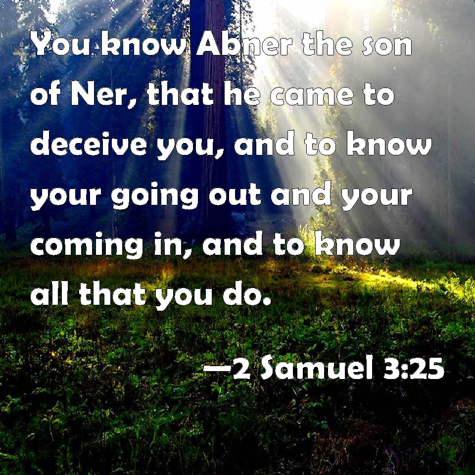 Choose a Background 2 Samuel 3:25 You know Abner the son of Ner, that he came to deceive you, and to know your going out and your coming in, and to know all that you do. KJV: Thou knowest Abner the son of Ner, that he came to deceive thee, and to know thy going out and thy coming in, and to know all that thou doest. DRB: Knowest thou not Abner the son of Ner, that to this end he came to thee, that he might deceive thee, and to know thy going out, and thy coming in, and to know all thou dost? DBT: Thou knowest Abner the son of Ner, that he came to deceive thee, to know thy going out and thy coming in, and to know all that thou doest. ERV: Thou knowest Abner the son of Ner, that he came to deceive thee, and to know thy going out and thy coming in, and to know all that thou doest. WBT: Thou knowest Abner the son of Ner, that he came to deceive thee, and to know thy going-out and thy coming-in, and to know all that thou doest. WEB: You know Abner the son of Ner, that he came to deceive you, and to know your going out and your coming in, and to know all that you do." YLT: Thou hast known Abner son of Ner, that to deceive thee he came, and to know thy going out and thy coming in, and to know all that thou art doing.'Links 2 Samuel 3:25 NIV • 2 Samuel 3:25 NLT • 2 Samuel 3:25 ESV • 2 Samuel 3:25 NASB • 2 Samuel 3:25 KJV • 2 Samuel 3:25 Interlinear • 2 Samuel 3:25 Commentaries • 2 Samuel 3:25 Parallel Texts • 2 Samuel 3:25 Bible Apps • 2 Samuel 3:25 Parallel • Bible Hub |