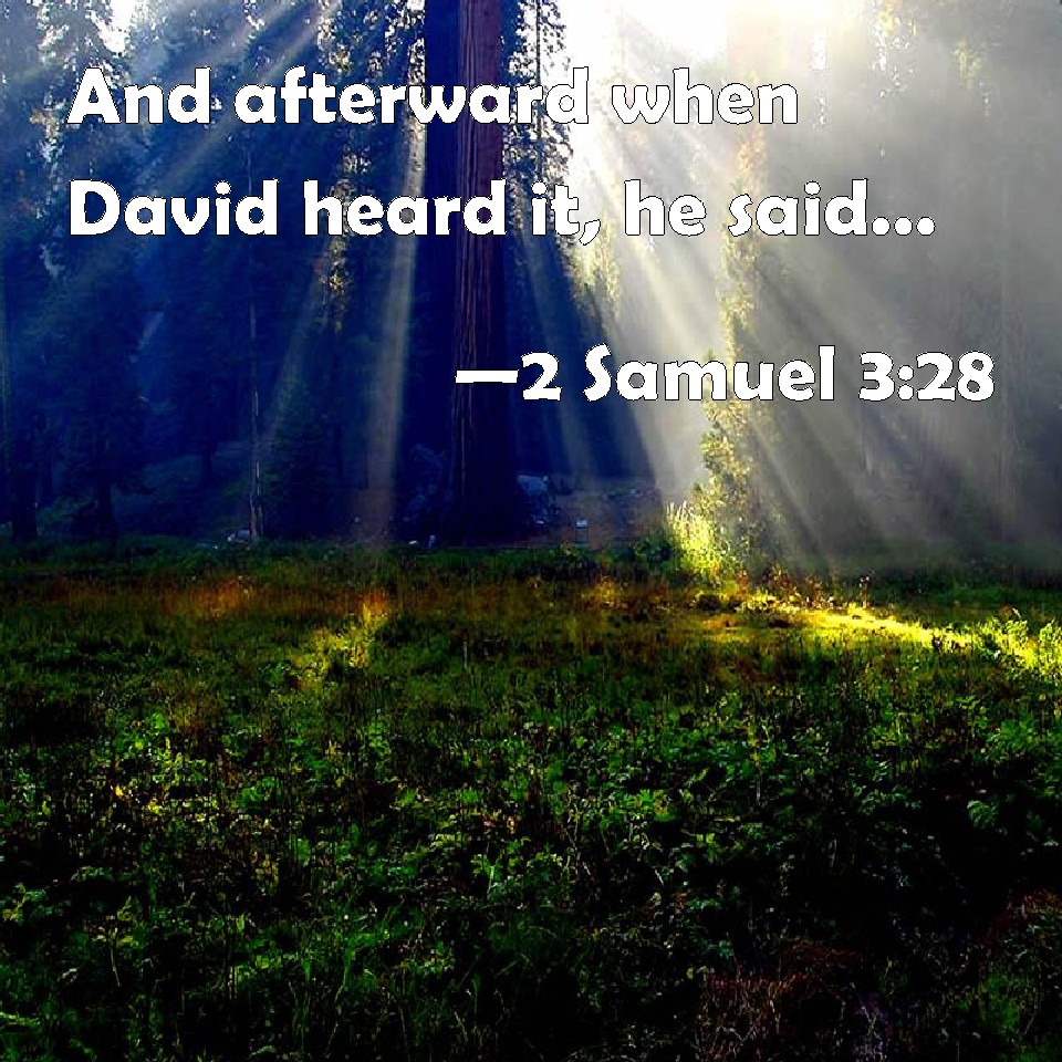 Choose a Background 2 Samuel 3:28 And afterward when David heard it, he said, I and my kingdom are guiltless before the LORD for ever from the blood of Abner the son of Ner: KJV: And afterward when David heard it, he said, I and my kingdom are guiltless before the LORD for ever from the blood of Abner the son of Ner: DRB: And when David heard of it, after the thing was now done, he said: I, and my kingdom are innocent before the Lord for ever of the blood of Abner the son of Ner: DBT: And afterwards David heard it, and he said, I and my kingdom are guiltless before Jehovah for ever from the blood of Abner the son of Ner: ERV: And afterward when David heard it, he said, I and my kingdom are guiltless before the LORD for ever from the blood of Abner the son of Ner: WBT: And afterward when David heard it, he said, I and my kingdom are guiltless before the LORD for ever from the blood of Abner the son of Ner: WEB: Afterward, when David heard it, he said, "I and my kingdom are guiltless before Yahweh forever of the blood of Abner the son of Ner. YLT: And David heareth afterwards and saith, 'Acquitted am I, and my kingdom, by Jehovah, unto the age, from the blood of Abner son of Ner;Links 2 Samuel 3:28 NIV • 2 Samuel 3:28 NLT • 2 Samuel 3:28 ESV • 2 Samuel 3:28 NASB • 2 Samuel 3:28 KJV • 2 Samuel 3:28 Interlinear • 2 Samuel 3:28 Commentaries • 2 Samuel 3:28 Parallel Texts • 2 Samuel 3:28 Bible Apps • 2 Samuel 3:28 Parallel • Bible Hub |