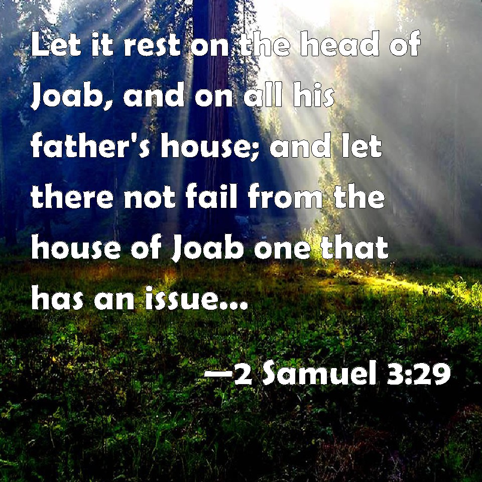 Choose a Background 2 Samuel 3:29 Let it rest on the head of Joab, and on all his father's house; and let there not fail from the house of Joab one that has an issue, or that is a leper, or that leans on a staff, or that falls on the sword, or that lacks bread. KJV: Let it rest on the head of Joab, and on all his father's house; and let there not fail from the house of Joab one that hath an issue, or that is a leper, or that leaneth on a staff, or that falleth on the sword, or that lacketh bread. DRB: And may it come upon the head of Joab, and upon all his father's house: and let there not fail from the house of Joab one that hath an issue of seed, or that is a leper, or that holdeth the distaff, or that falleth by the sword, or that wanteth bread. DBT: let it fall on the head of Joab, and on all his father's house; and let there not fail from the house of Joab one that has an issue, or that is a leper, or that leans on a staff, or that falls by the sword, or that lacks bread! ERV: let it fall upon the head of Joab, and upon all his father's house; and let there not fail from the house of Joab one that hath an issue, or that is a leper, or that leaneth on a staff, or that falleth by the sword, or that lacketh bread. WBT: Let it rest on the head of Joab, and on all his father's house; and let there not fail from the house of Joab one that hath an issue, or that is a leper, or that leaneth on a staff, or that falleth on the sword, or that lacketh bread. WEB: Let it fall on the head of Joab, and on all his father's house. Let there not fail from the house of Joab one who has an issue, or who is a leper, or who leans on a staff, or who falls by the sword, or who lacks bread." YLT: it doth stay on the head of Joab, and on all the house of his father, and there is not cut off from the house of Joab one having an issue, and leprous, and laying hold on a staff, and falling by a sword, and lacking bread.'Links 2 Samuel 3:29 NIV • 2 Samuel 3:29 NLT • 2 Samuel 3:29 ESV • 2 Samuel 3:29 NASB • 2 Samuel 3:29 KJV • 2 Samuel 3:29 Interlinear • 2 Samuel 3:29 Commentaries • 2 Samuel 3:29 Parallel Texts • 2 Samuel 3:29 Bible Apps • 2 Samuel 3:29 Parallel • Bible Hub |