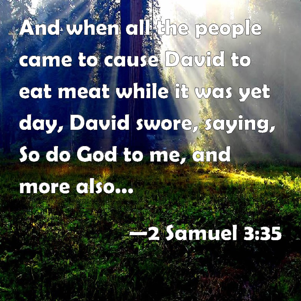 Choose a Background 2 Samuel 3:35 And when all the people came to cause David to eat meat while it was yet day, David swore, saying, So do God to me, and more also, if I taste bread, or ought else, till the sun be down. KJV: And when all the people came to cause David to eat meat while it was yet day, David sware, saying, So do God to me, and more also, if I taste bread, or ought else, till the sun be down. DRB: And when all the people came to take meat with David, while it was yet broad day, David swore, saying: So do God to me, and more also, if I taste bread or any thing else before sunset. DBT: And all the people came to cause David to eat bread while it was yet day; but David swore, saying, So do God to me, and more also, if I taste bread or aught else till the sun be down! ERV: And all the people came to cause David to eat bread while it was yet day; but David sware, saying, God do so to me, and more also, if I taste bread, or aught else, till the sun be down. WBT: And when all the people came to cause David to eat food while it was yet day, David swore, saying, So do God to me, and more also, If I taste bread or aught else, till the sun is down. WEB: All the people came to cause David to eat bread while it was yet day; but David swore, saying, "God do so to me, and more also, if I taste bread, or anything else, until the sun goes down." YLT: And all the people come to cause David to eat bread while yet day, and David sweareth, saying, 'Thus doth God to me, and thus He doth add, for — before the going in of the sun, I taste no bread or any other thing.'Links 2 Samuel 3:35 NIV • 2 Samuel 3:35 NLT • 2 Samuel 3:35 ESV • 2 Samuel 3:35 NASB • 2 Samuel 3:35 KJV • 2 Samuel 3:35 Interlinear • 2 Samuel 3:35 Commentaries • 2 Samuel 3:35 Parallel Texts • 2 Samuel 3:35 Bible Apps • 2 Samuel 3:35 Parallel • Bible Hub |