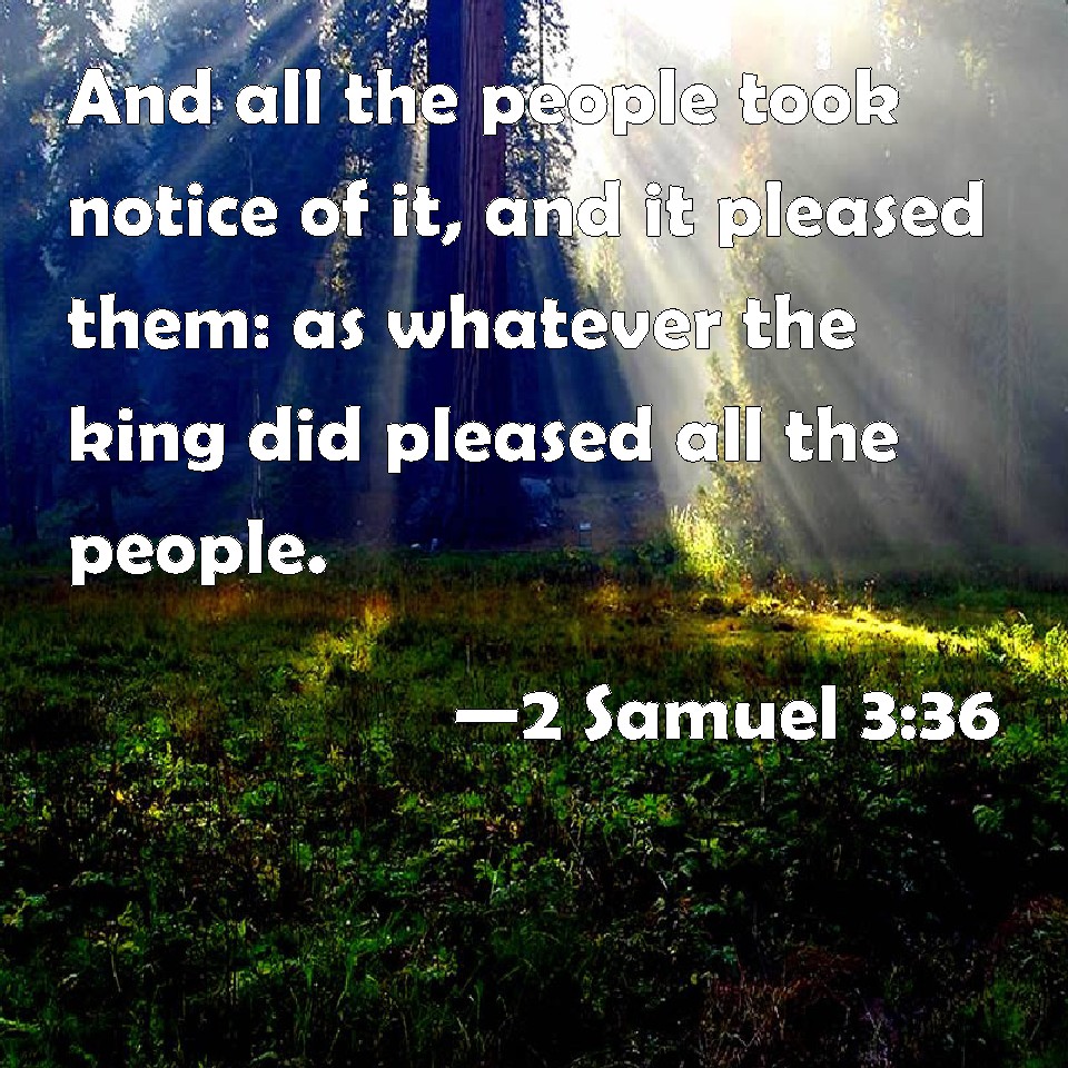 Choose a Background 2 Samuel 3:36 And all the people took notice of it, and it pleased them: as whatever the king did pleased all the people. KJV: And all the people took notice of it, and it pleased them: as whatsoever the king did pleased all the people. DRB: And all the people heard, and they were pleased, and all that the king did seemed good in the sight of all the people. DBT: And all the people remarked it, and it pleased them; as whatever the king did pleased all the people. ERV: And all the people took notice of it, and it pleased them: as whatsoever the king did pleased all the people. WBT: And all the people took notice of it, and it pleased them: as what ever the king did pleased all the people. WEB: All the people took notice of it, and it pleased them; as whatever the king did pleased all the people. YLT: And all the people have discerned it, and it is good in their eyes, as all that the king hath done is good in the eyes of all the people;Links 2 Samuel 3:36 NIV • 2 Samuel 3:36 NLT • 2 Samuel 3:36 ESV • 2 Samuel 3:36 NASB • 2 Samuel 3:36 KJV • 2 Samuel 3:36 Interlinear • 2 Samuel 3:36 Commentaries • 2 Samuel 3:36 Parallel Texts • 2 Samuel 3:36 Bible Apps • 2 Samuel 3:36 Parallel • Bible Hub |