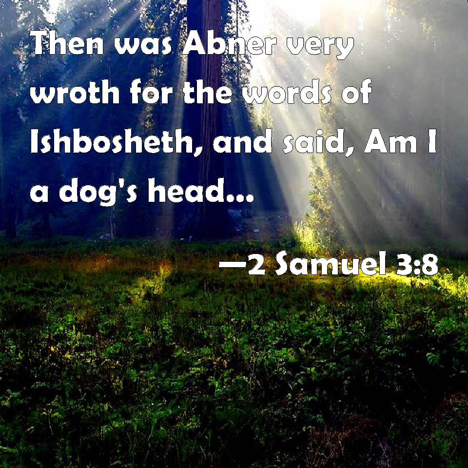 Choose a Background 2 Samuel 3:8 Then was Abner very wroth for the words of Ishbosheth, and said, Am I a dog's head, which against Judah do show kindness this day to the house of Saul your father, to his brothers, and to his friends, and have not delivered you into the hand of David, that you charge me to day with a fault concerning this woman? KJV: Then was Abner very wroth for the words of Ishbosheth, and said, Am I a dog's head, which against Judah do shew kindness this day unto the house of Saul thy father, to his brethren, and to his friends, and have not delivered thee into the hand of David, that thou chargest me to day with a fault concerning this woman? DRB: Why didst thou go in to my father's concubine? And he was exceedingly angry for the words of Isboseth, and said: Am I a dog's head against Juda this day, who have shewn mercy to the house of Saul thy father, and to his brethren and friends, and have not delivered thee into the hands of David, and hast thou sought this day against me to charge me with a matter concerning a woman? DBT: Then was Abner very wroth for the words of Ishbosheth, and said, Am I a dog's head, I who against Judah do shew kindness this day to the house of Saul thy father, to his brethren, and to his friends, and have not delivered thee into the hand of David, that thou reproachest me this day with the fault of this woman? ERV: Then was Abner very wroth for the words of Ish-bosheth, and said, Am I a dog's head that belongeth to Judah? This day do I shew kindness unto the house of Saul thy father, to his brethren, and to his friends, and have not delivered thee into the hand of David, and yet thou chargest me this day with a fault concerning this woman. WBT: Then was Abner very wroth for the words of Ish-bosheth, and said, Am I a dog's head, who against Judah do show kindness this day to the house of Saul thy father, to his brethren, and to his friends, and have not delivered thee into the hand of David, that thou chargest me to-day with a fault concerning this woman? WEB: Then was Abner very angry for the words of Ishbosheth, and said, "Am I a dog's head that belongs to Judah? Today I show kindness to the house of Saul your father, to his brothers, and to his friends, and have not delivered you into the hand of David; and yet you charge me this day with a fault concerning this woman! YLT: And it is displeasing to Abner exceedingly, because of the words of Ish-Bosheth, and he saith, 'The head of a dog am I — that in reference to Judah to-day I do kindness with the house of Saul thy father, unto his brethren, and unto his friends, and have not delivered thee into the hand of David — that thou chargest against me iniquity concerning the woman to-day?Links 2 Samuel 3:8 NIV • 2 Samuel 3:8 NLT • 2 Samuel 3:8 ESV • 2 Samuel 3:8 NASB • 2 Samuel 3:8 KJV • 2 Samuel 3:8 Interlinear • 2 Samuel 3:8 Commentaries • 2 Samuel 3:8 Parallel Texts • 2 Samuel 3:8 Bible Apps • 2 Samuel 3:8 Parallel • Bible Hub |