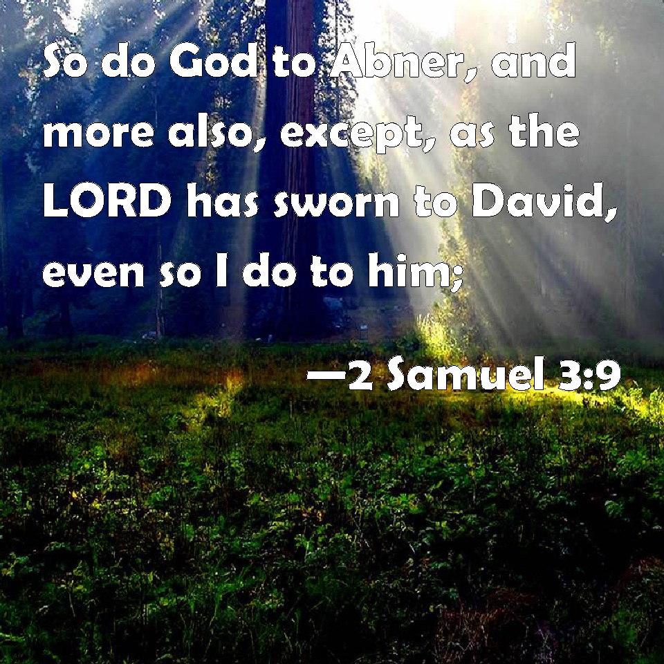 Choose a Background 2 Samuel 3:9 So do God to Abner, and more also, except, as the LORD has sworn to David, even so I do to him; KJV: So do God to Abner, and more also, except, as the LORD hath sworn to David, even so I do to him; DRB: So do God to Abner, and more also, unless as the Lord hath sworn to David, so I do to him, DBT: So do God to Abner, and more also, if, as Jehovah has sworn to David, I do not so to him; ERV: God do so to Abner, and more also, if, as the LORD hath sworn to David, I do not even so to him; WBT: So do God to Abner, and more also, except, as the LORD hath sworn to David, even so I do to him; WEB: God do so to Abner, and more also, if, as Yahweh has sworn to David, I don't do even so to him; YLT: thus doth God to Abner, and thus He doth add to him, surely as Jehovah hath sworn to David — surely so I do to him:Links 2 Samuel 3:9 NIV • 2 Samuel 3:9 NLT • 2 Samuel 3:9 ESV • 2 Samuel 3:9 NASB • 2 Samuel 3:9 KJV • 2 Samuel 3:9 Interlinear • 2 Samuel 3:9 Commentaries • 2 Samuel 3:9 Parallel Texts • 2 Samuel 3:9 Bible Apps • 2 Samuel 3:9 Parallel • Bible Hub |