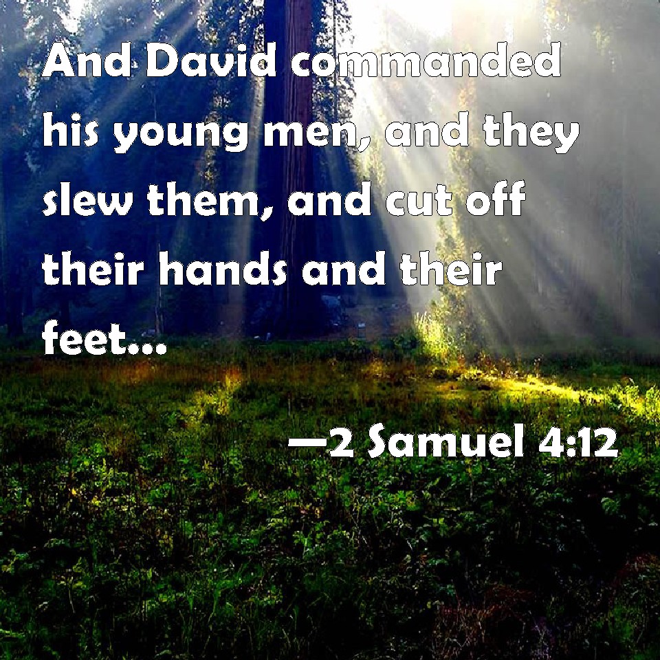 Choose a Background 2 Samuel 4:12 And David commanded his young men, and they slew them, and cut off their hands and their feet, and hanged them up over the pool in Hebron. But they took the head of Ishbosheth, and buried it in the sepulcher of Abner in Hebron. KJV: And David commanded his young men, and they slew them, and cut off their hands and their feet, and hanged them up over the pool in Hebron. But they took the head of Ishbosheth, and buried it in the sepulchre of Abner in Hebron. DRB: And David commanded his servants and they slew them: and cutting off their hands and feet, hanged them up over the pool in Hebron: but the head of Isboseth they took and buried in the sepulchre of Abner in Hebron. DBT: And David commanded his young men, and they slew them, and cut off their hands and their feet, and hanged them up over the pool in Hebron. But they took the head of Ishbosheth, and buried it in the sepulchre of Abner in Hebron. ERV: And David commanded his young men, and they slew them, and cut off their hands and their feet, and hanged them up_ beside the pool in Hebron. But they took the head of Ish-bosheth, and buried it in the grave of Abner in Hebron. WBT: And David commanded his young men, and they slew them, and cut off their hands and their feet, and hanged them over the pool in Hebron. But they took the head of Ish-bosheth, and buried it in the sepulcher of Abner in Hebron. WEB: David commanded his young men, and they killed them, and cut off their hands and their feet, and hanged them up beside the pool in Hebron. But they took the head of Ishbosheth, and buried it in the grave of Abner in Hebron. YLT: And David commandeth the young men, and they slay them, and cut off their hands and their feet, and hang them over the pool in Hebron, and the head of Ish-Bosheth they have taken, and bury it in the burying-place of Abner in Hebron.Links 2 Samuel 4:12 NIV • 2 Samuel 4:12 NLT • 2 Samuel 4:12 ESV • 2 Samuel 4:12 NASB • 2 Samuel 4:12 KJV • 2 Samuel 4:12 Interlinear • 2 Samuel 4:12 Commentaries • 2 Samuel 4:12 Parallel Texts • 2 Samuel 4:12 Bible Apps • 2 Samuel 4:12 Parallel • Bible Hub |