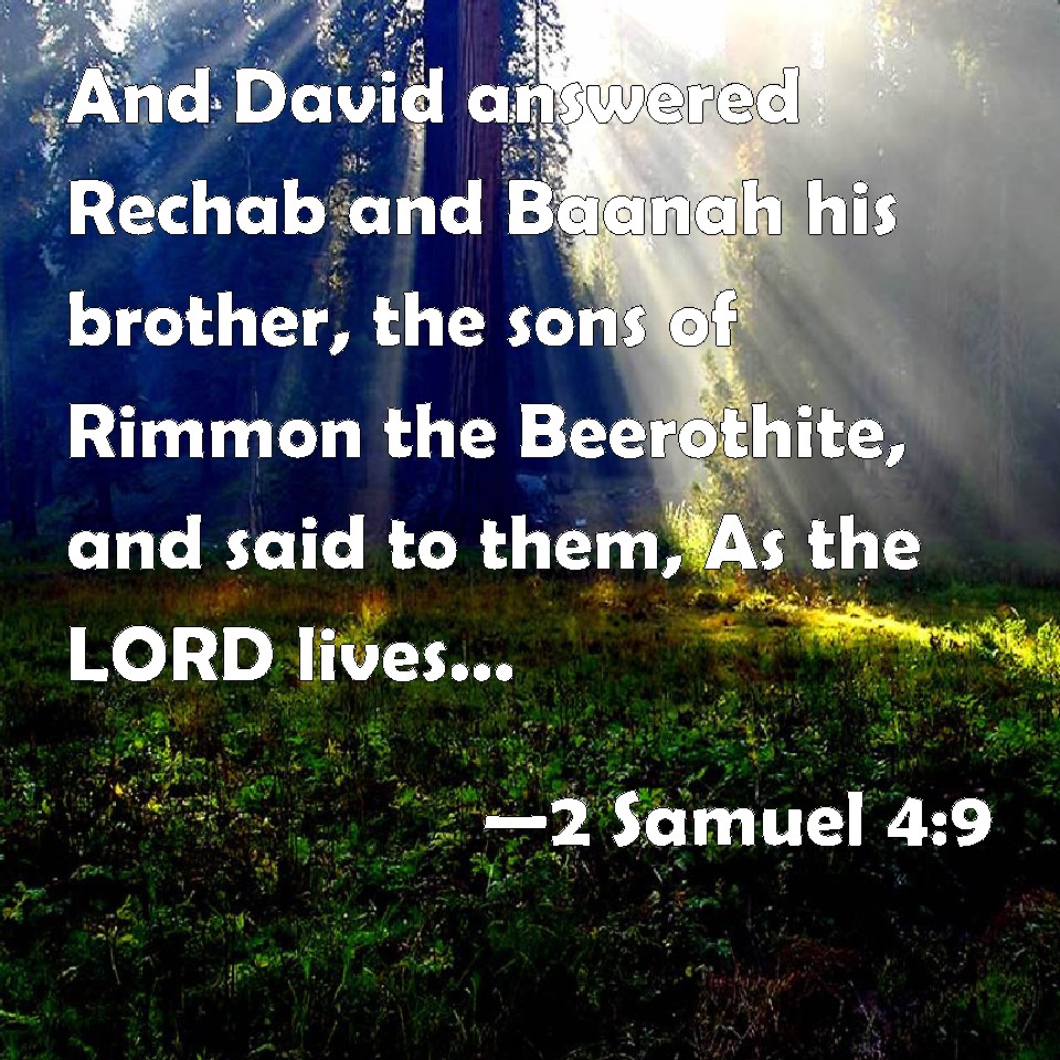 Choose a Background 2 Samuel 4:9 And David answered Rechab and Baanah his brother, the sons of Rimmon the Beerothite, and said to them, As the LORD lives, who has redeemed my soul out of all adversity, KJV: And David answered Rechab and Baanah his brother, the sons of Rimmon the Beerothite, and said unto them, As the LORD liveth, who hath redeemed my soul out of all adversity, DRB: But David answered Rechab, and Baana his brother, the sons of Remmon the Berothite, and said to them: As the Lord liveth, who hath delivered my soul out of all distress, DBT: Then David answered Rechab and Baanah his brother, the sons of Rimmon the Beerothite, and said to them, As Jehovah liveth, who has redeemed my soul out of all distress, ERV: And David answered Rechab and Baanah his brother, the sons of Rimmon the Beerothite, and said unto them, As the LORD liveth, who hath redeemed my soul out of all adversity, WBT: And David answered Rechab and Baanah his brother, the sons of Rimmon the Beerothite, and said to them, As the LORD liveth, who hath redeemed my soul out of all adversity, WEB: David answered Rechab and Baanah his brother, the sons of Rimmon the Beerothite, and said to them, "As Yahweh lives, who has redeemed my soul out of all adversity, YLT: And David answereth Rechab and Baanah his brother, sons of Rimmon the Beerothite, and saith to them, 'Jehovah liveth, who hath redeemed my soul out of all adversity,Links 2 Samuel 4:9 NIV • 2 Samuel 4:9 NLT • 2 Samuel 4:9 ESV • 2 Samuel 4:9 NASB • 2 Samuel 4:9 KJV • 2 Samuel 4:9 Interlinear • 2 Samuel 4:9 Commentaries • 2 Samuel 4:9 Parallel Texts • 2 Samuel 4:9 Bible Apps • 2 Samuel 4:9 Parallel • Bible Hub |