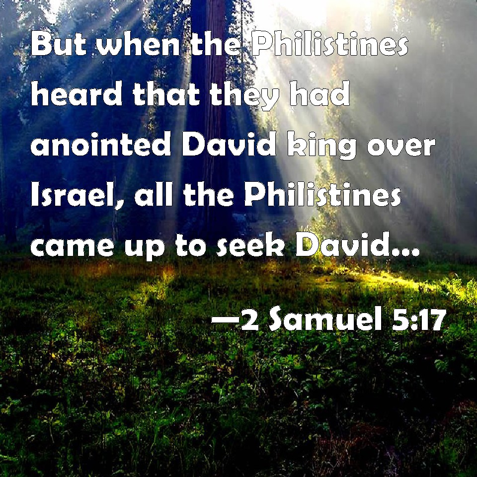 Choose a Background 2 Samuel 5:17 But when the Philistines heard that they had anointed David king over Israel, all the Philistines came up to seek David; and David heard of it, and went down to the hold. KJV: But when the Philistines heard that they had anointed David king over Israel, all the Philistines came up to seek David; and David heard of it, and went down to the hold. DRB: And the Philistines heard that they had anointed David to be king over Israel: and they all came to seek David: and when David heard of it, he went down to a strong hold. DBT: And the Philistines heard that they had anointed David king over Israel, and all the Philistines went up to seek David; and David heard of it, and went down to the stronghold. ERV: And when the Philistines heard that they had anointed David king over Israel, all the Philistines went up to seek David; and David heard of it, and went down to the hold. WBT: But when the Philistines heard that they had anointed David king over Israel, all the Philistines came up to seek David; and David heard of it, and went down to the hold. WEB: When the Philistines heard that they had anointed David king over Israel, all the Philistines went up to seek David; and David heard of it, and went down to the stronghold. YLT: And the Philistines hear that they have anointed David for king over Israel, and all the Philistines come up to seek David, and David heareth, and goeth down unto the fortress,Links 2 Samuel 5:17 NIV • 2 Samuel 5:17 NLT • 2 Samuel 5:17 ESV • 2 Samuel 5:17 NASB • 2 Samuel 5:17 KJV • 2 Samuel 5:17 Interlinear • 2 Samuel 5:17 Commentaries • 2 Samuel 5:17 Parallel Texts • 2 Samuel 5:17 Bible Apps • 2 Samuel 5:17 Parallel • Bible Hub |